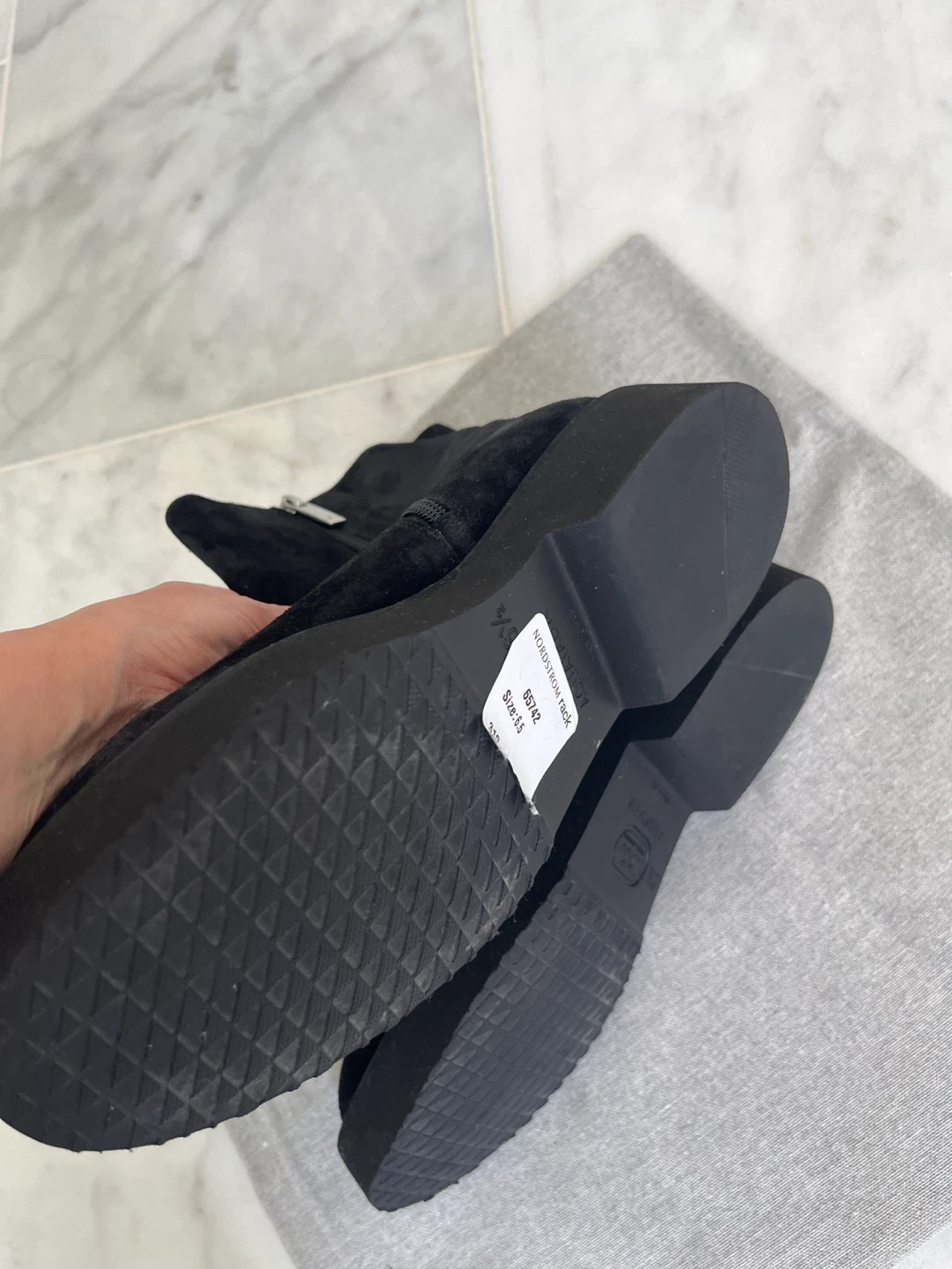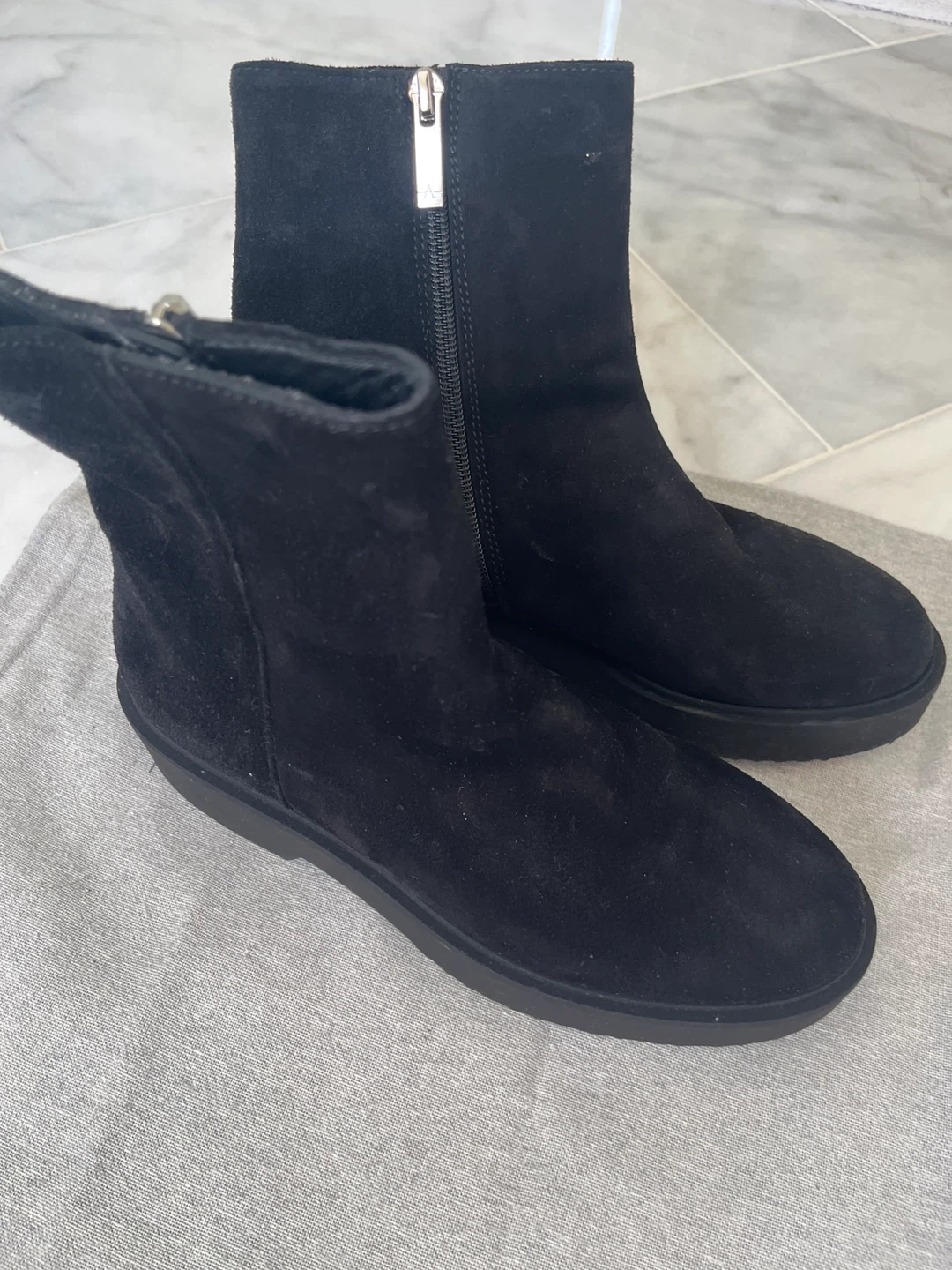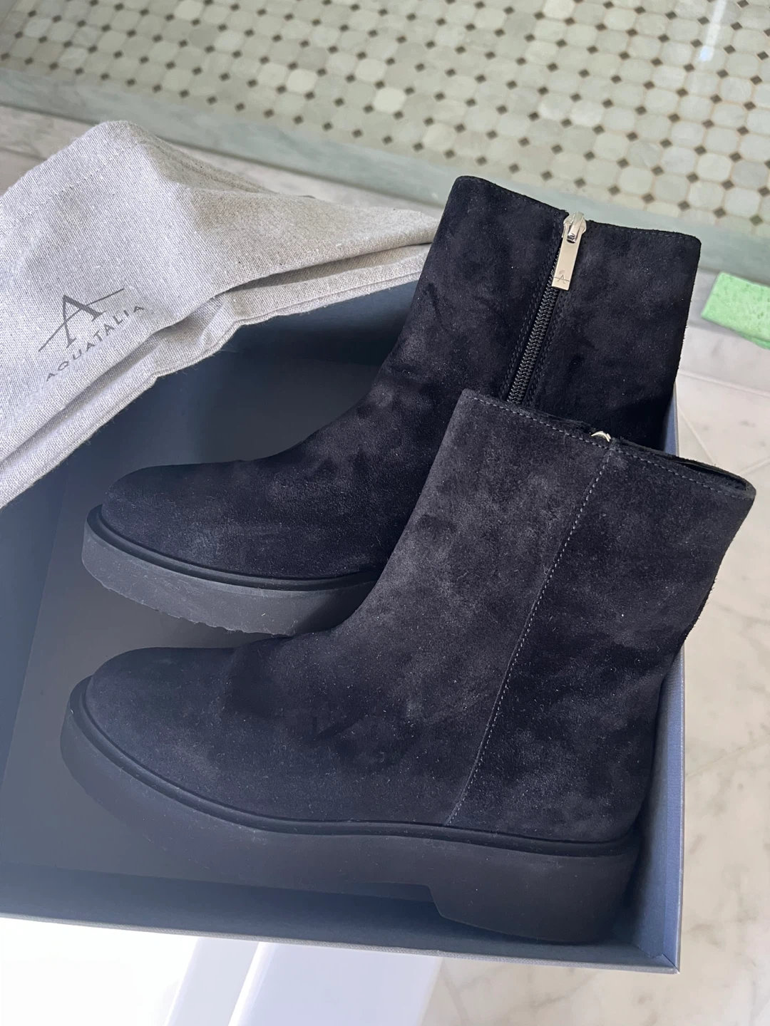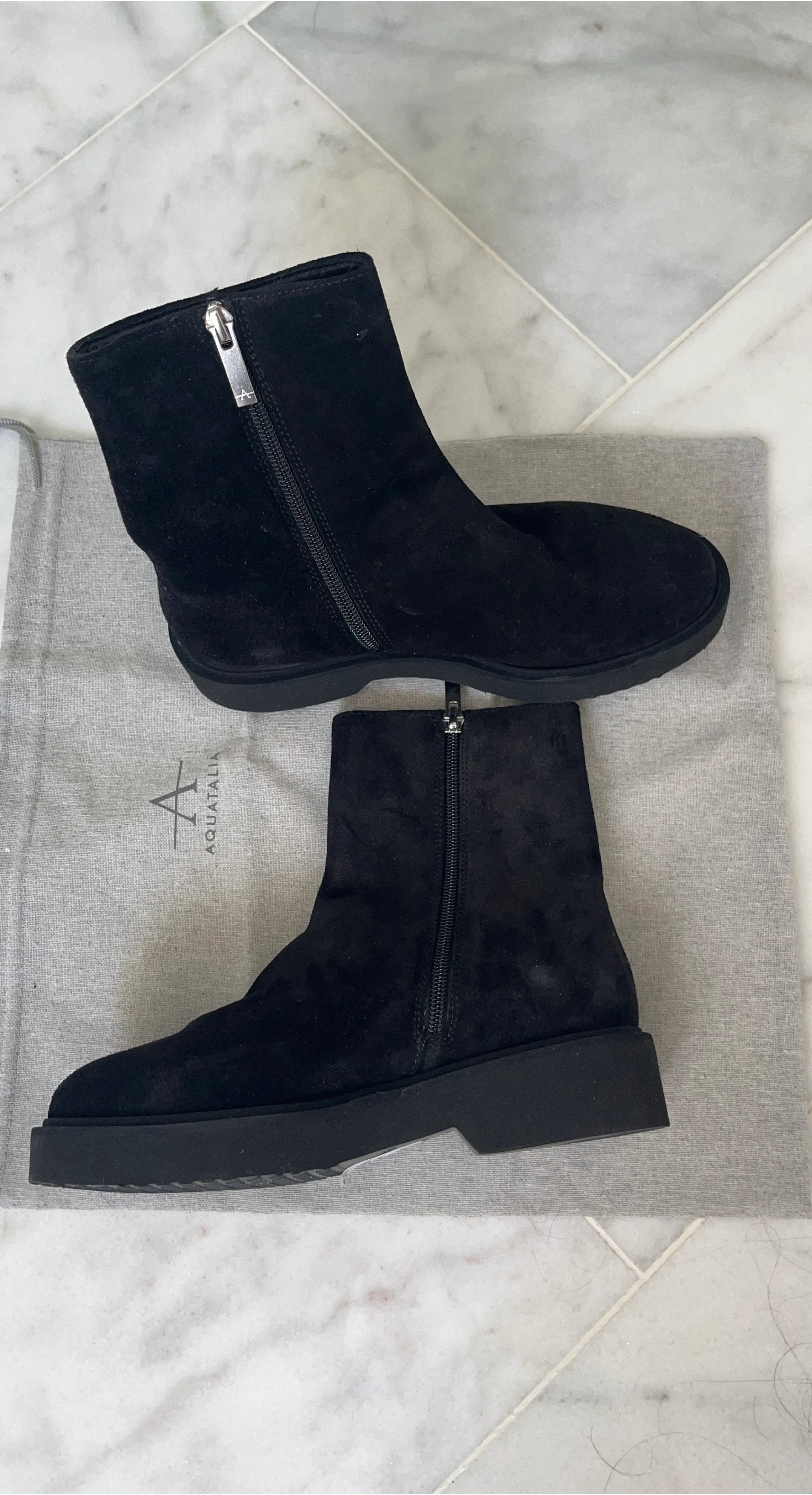 Selling a pair of Aquatalia ankle boots in black suede. These boots feature a stylish zipper detail and are in great condition. They come with the original dust bag for storage and protection. Perfect for adding a touch of elegance to any outfit!