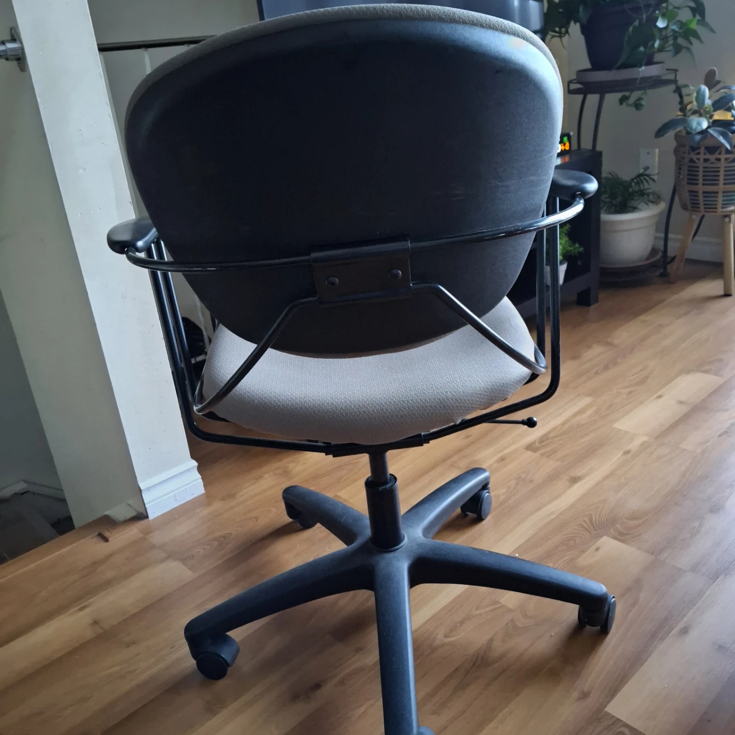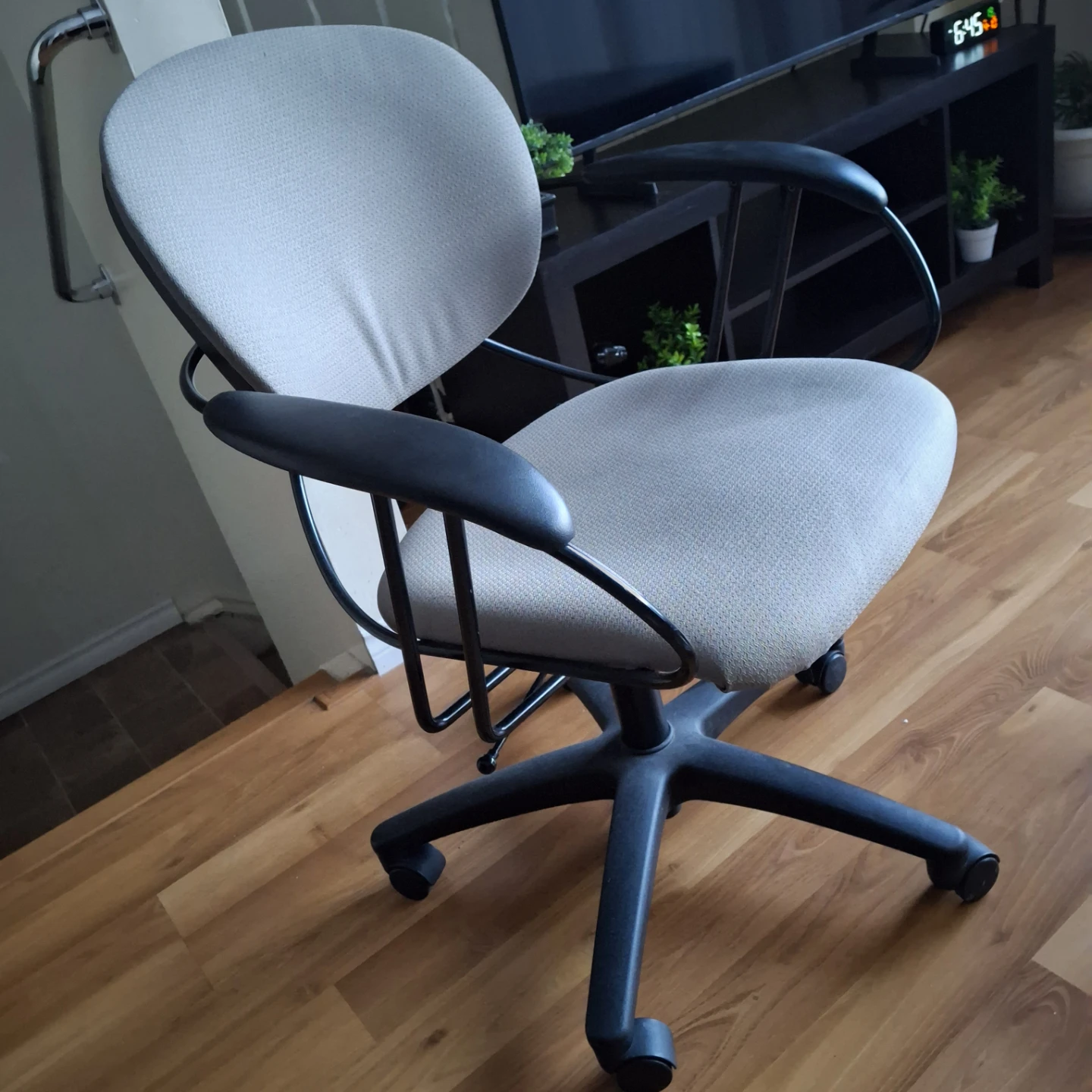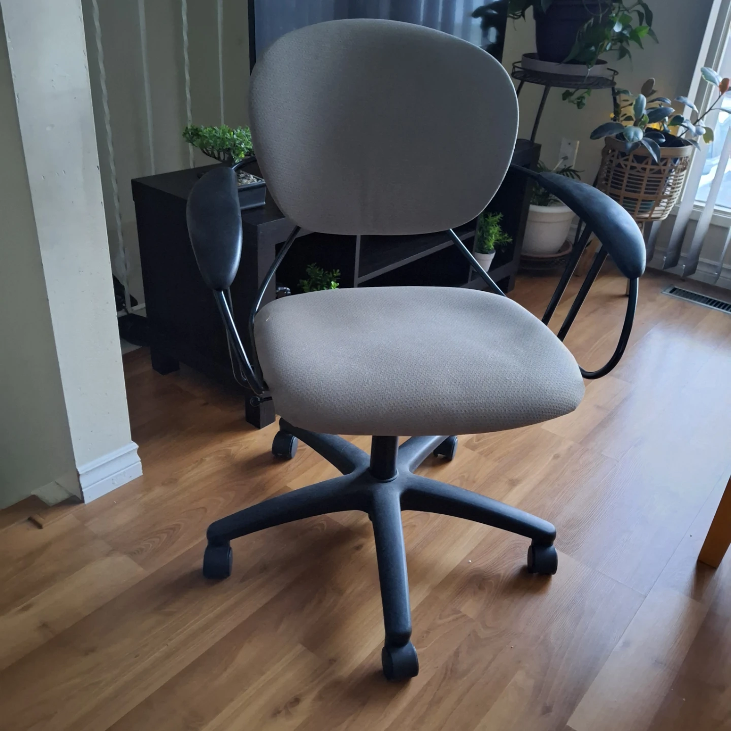 Office chair in good condition. Perfect for your home office setup or study space. The chair is grey and has black armrests and a black base with castor wheels and adjustable height