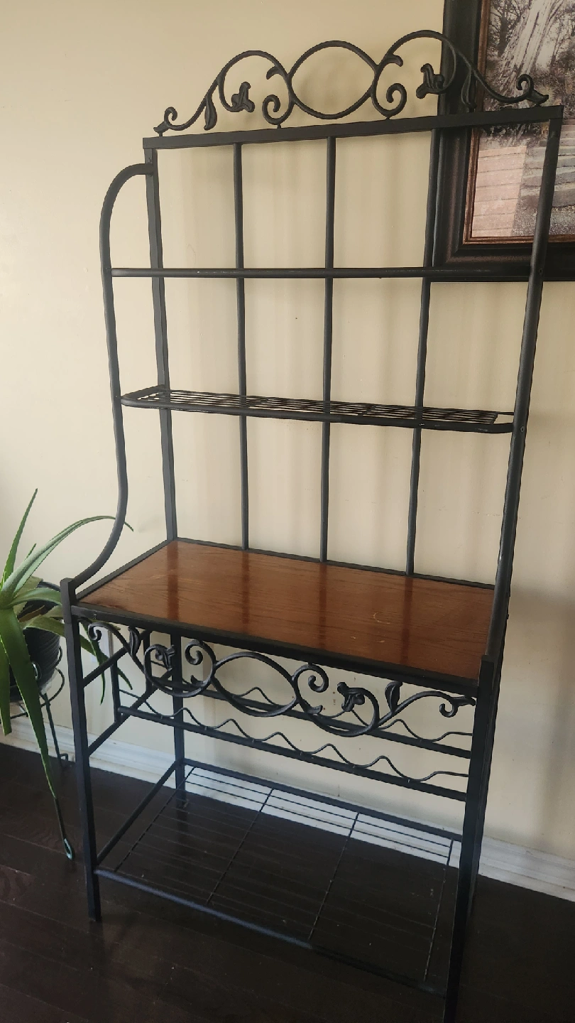 Selling a bakers rack with a black metal frame and wooden shelf. It has a decorative design and provides ample storage space. Perfect for adding a touch of elegance to your kitchen or dining area!