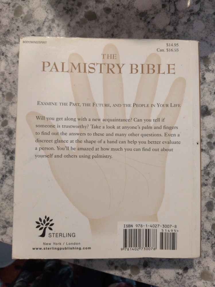Selling "The Palmistry Bible" by Jane Struthers! It's a definitive guide to hand reading. Examine the past, the future, and the people in your life. Will you get along with a new acquaintance? Can you tell if someone is trustworthy? Take a look at anyone's palm and fingers to find out the answers to these and many other questions. Even a discreet glance at the shape of a hand can help you better evaluate a person. You'll be amazed at how much you can find out about yourself and others using palmistry