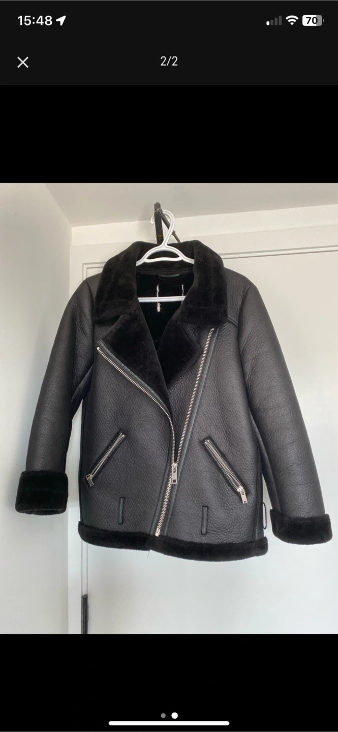 Selling a stylish black Korean style jacket! It's in great condition and perfect for staying warm and fashionable. The jacket features a classic asymmetrical zip closure and cozy shearling lining and trim. No belt.