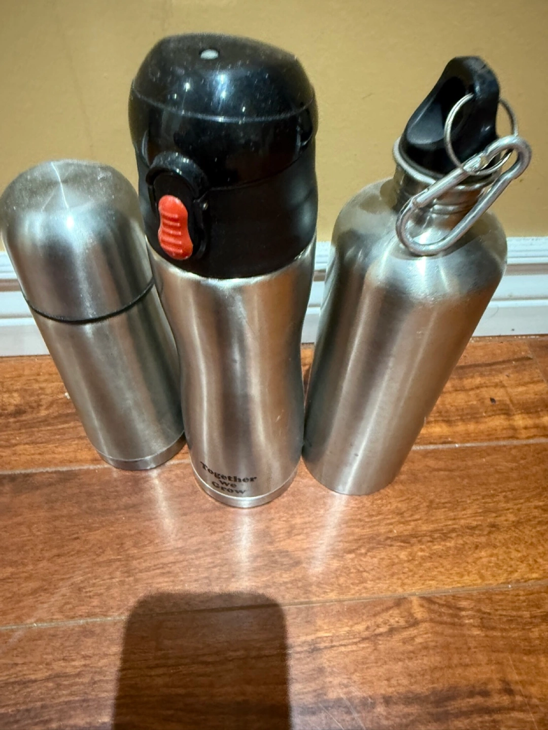 Selling a set of three stainless steel water bottles. They are in used condition. One bottle has a black top with a red button, and another has a carabiner clip. The bottles are silver in colour. One of the bottles has the words 'Together We Grow' printed on it