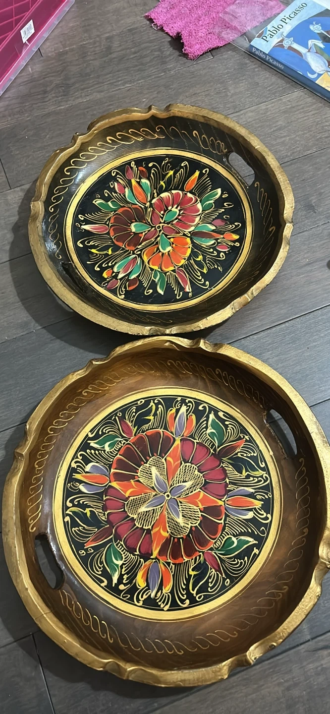 Selling a set of two decorative wooden trays. They feature a floral design in the centre with a gold trim. Perfect for adding a touch of elegance to your home decor!