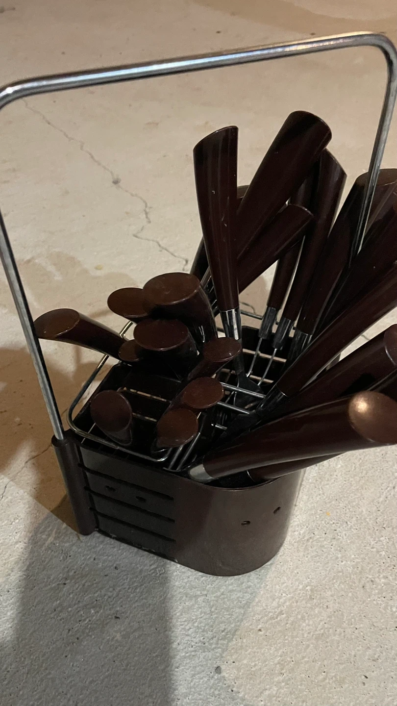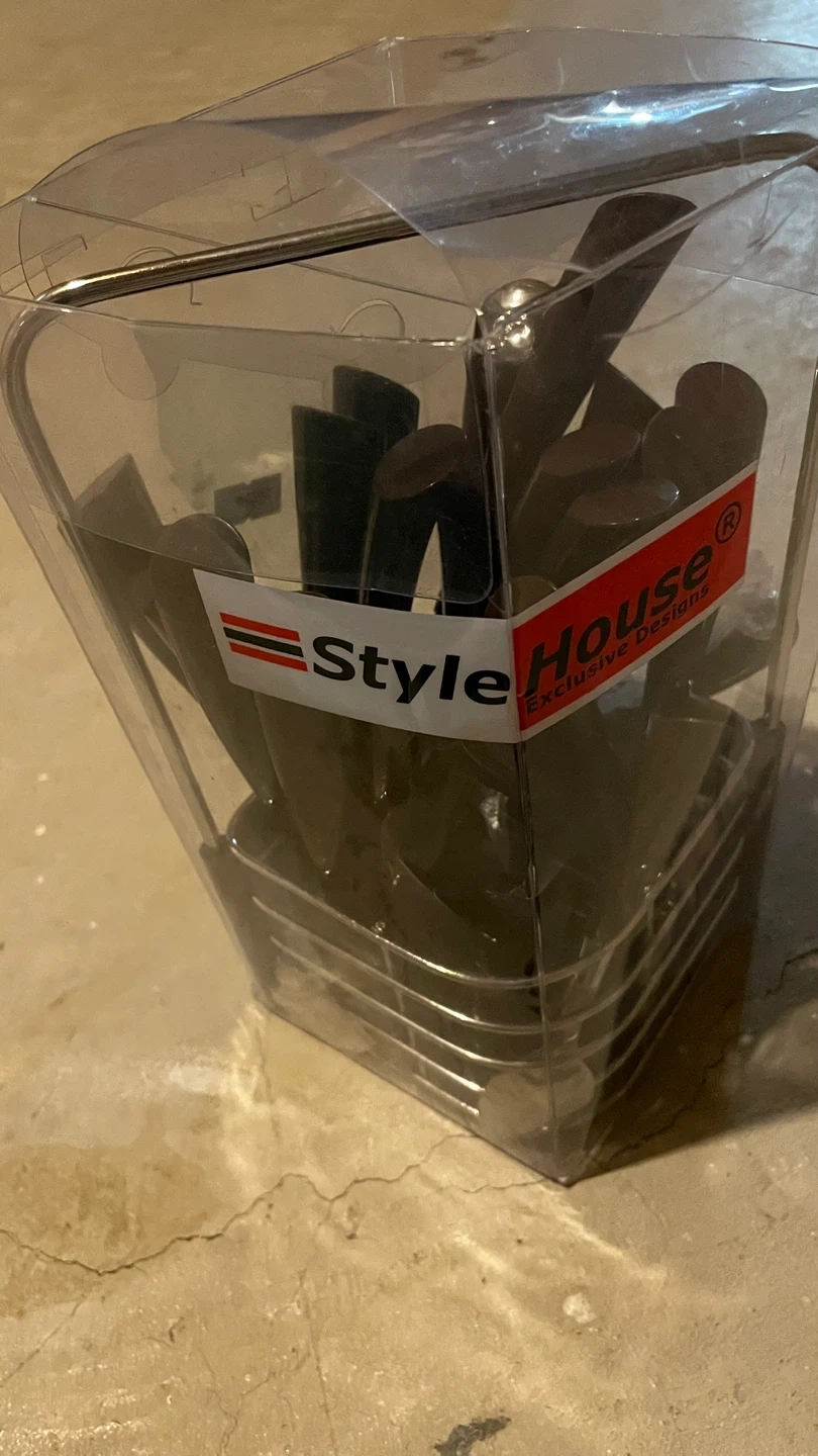 Selling a Style House cutlery set. It comes in its original packaging. The set includes knives, forks and spoons with dark brown handles and a metal holder. 1new 1 like new
