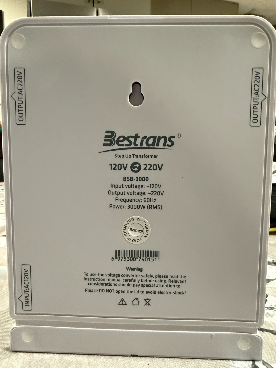 Selling a brand new Bestrans Step Up Transformer, perfect for converting 120V to 220V. It's ideal for using appliances from Europe, China, Korea, and Hong Kong in Canada or the US. This model is the BSB-3000 and can handle a power of 3000W (RMS). It measures 24cm (9.4") in height, 18.5cm (7.3") in length, and 7cm (2.8") in width, weighing 7.2kg (15.87lb).