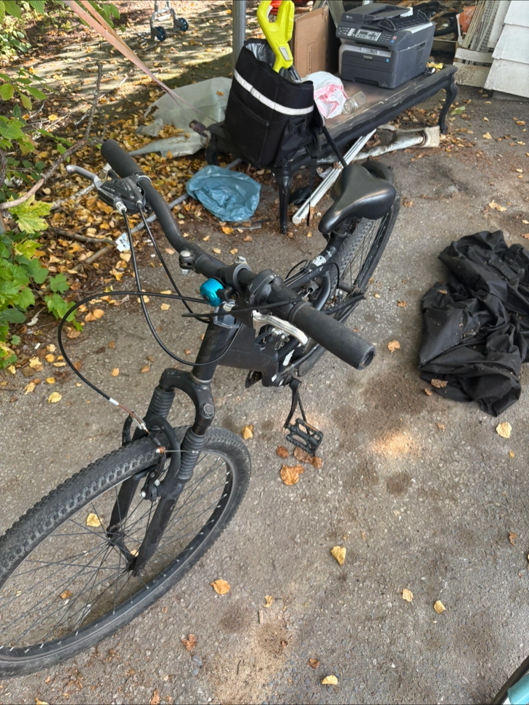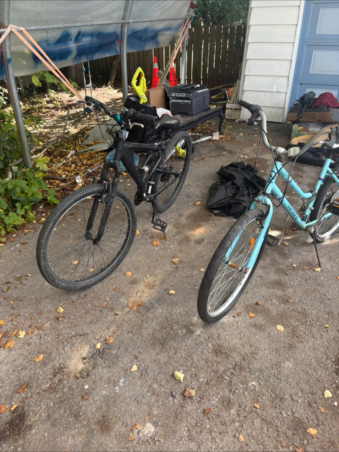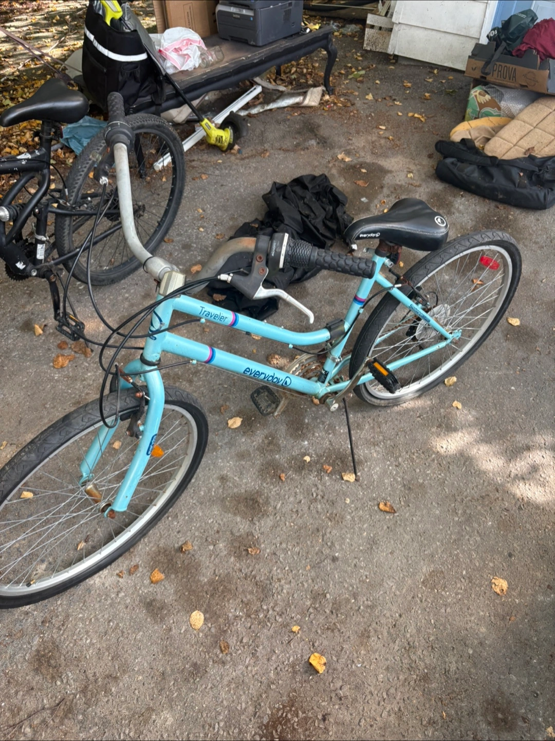 Selling two used bikes. One is a black mountain bike, and the other is a light blue 'Everyday Traveller' bike. Both have signs of wear and tear, but they're ready for a new home! 80
