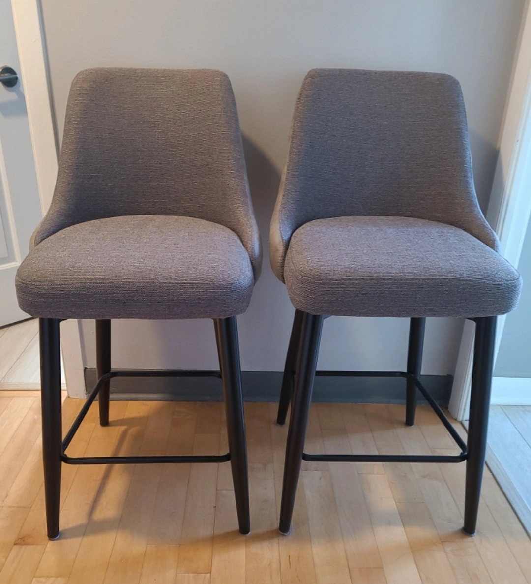 Selling 2 counter height / bar stools. They have a soft comfortable upholstered sturdsy seat and back in a stylish grey fabric with a quilted design. The legs are a sleek black metal, offering a sturdy and contemporary look.