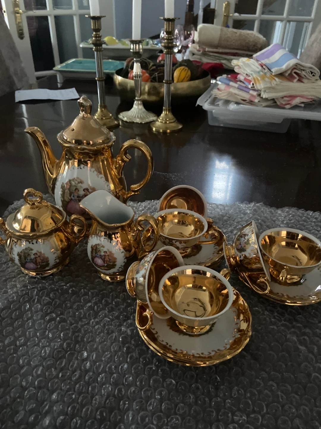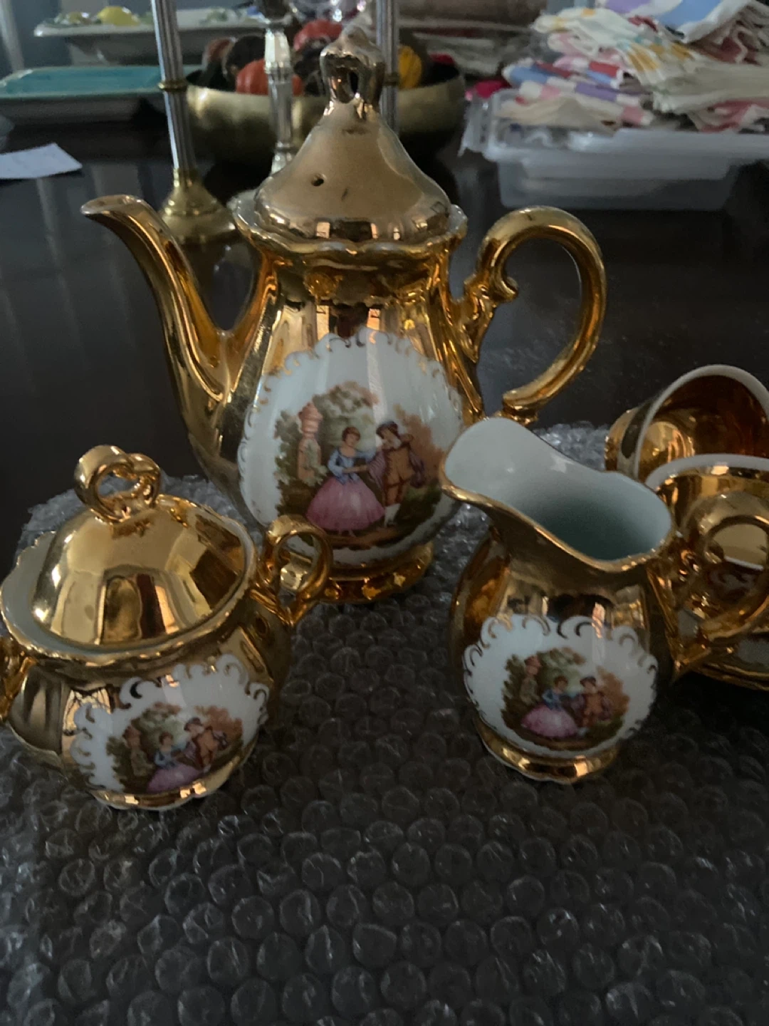 Beautiful vintage gold porcelain tea set. Includes a teapot, sugar bowl, creamer, and several cups and saucers. Perfect for adding a touch of elegance to your tea time
