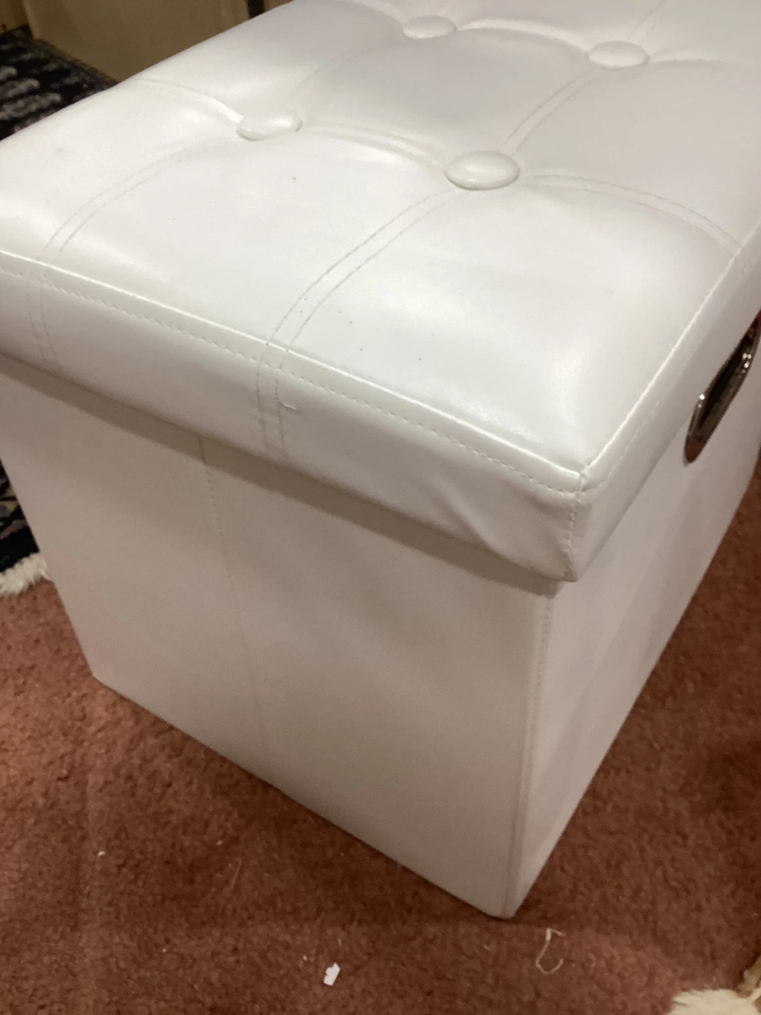 Selling 2 handy storage bins there white with a tufted top and a storage compartment inside. Great for tidying up your space and adding a little extra seating too! Nothing is wrong with them I just need them to go as soon as possible.