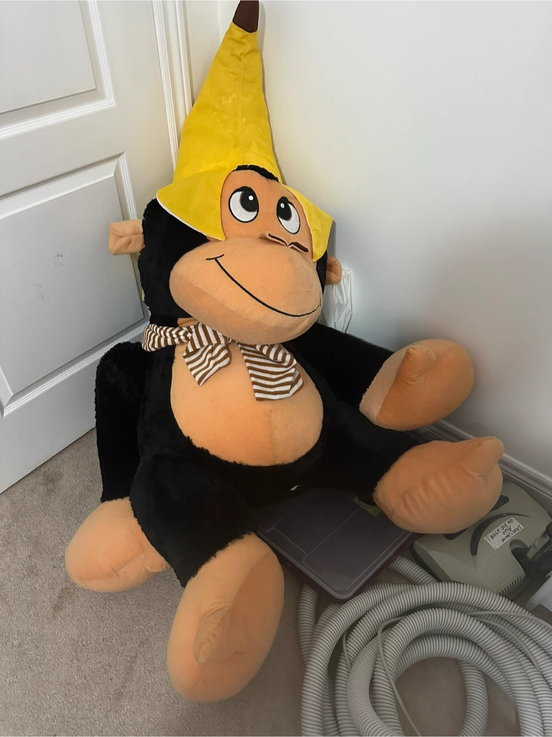 Selling a large, cuddly monkey! It's wearing a cute yellow banana hat and a striped scarf. Perfect for kids or anyone who loves stuffed animals