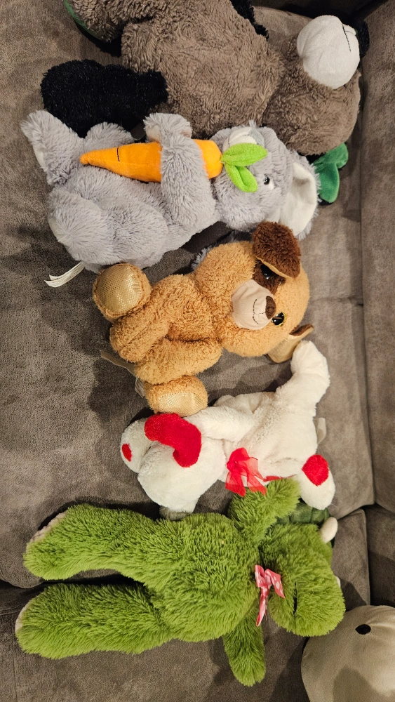 Selling a variety of gently used plush toys! Perfect for kids or collectors. There's a blue snake, a snowman, a Spider-Man plush, and many more. All in good condition and ready for a new home