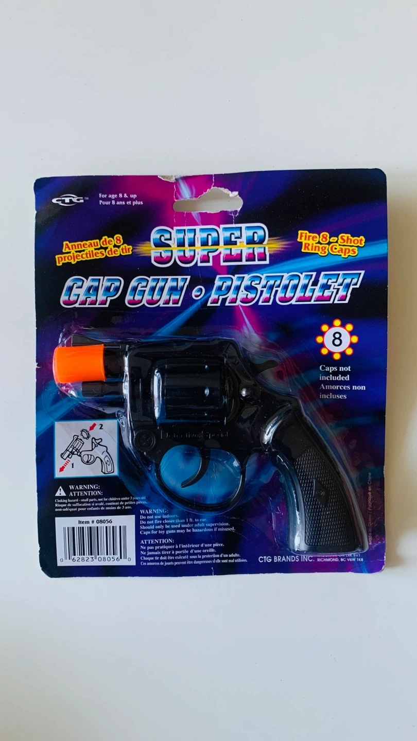 Selling a Super Cap Gun Pistolet! It's designed to fire 8-shot ring caps. Please note that the caps are not included. It is recommended for ages 8 and up, and adult supervision is required during use.