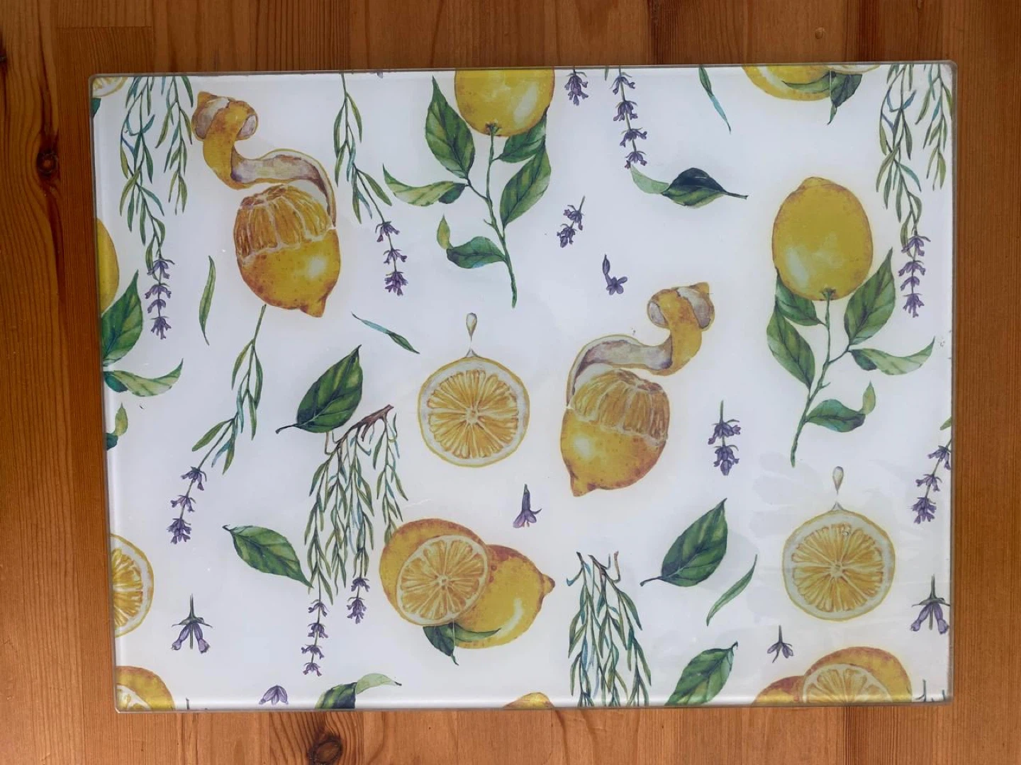 A decorative glass cutting board featuring a charming lemon and lavender print. It's a lovely addition to any kitchen counter. Glass material.