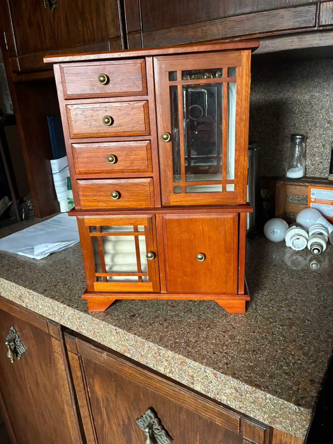 A lovely wooden jewellery box cabinet with multiple drawers and compartments for storing all your precious items. It has a classic design and is in great shape. Perfect for keeping your jewellery organized and adding a touch of elegance to your space Has two little marks on the top otherwise excellent condition