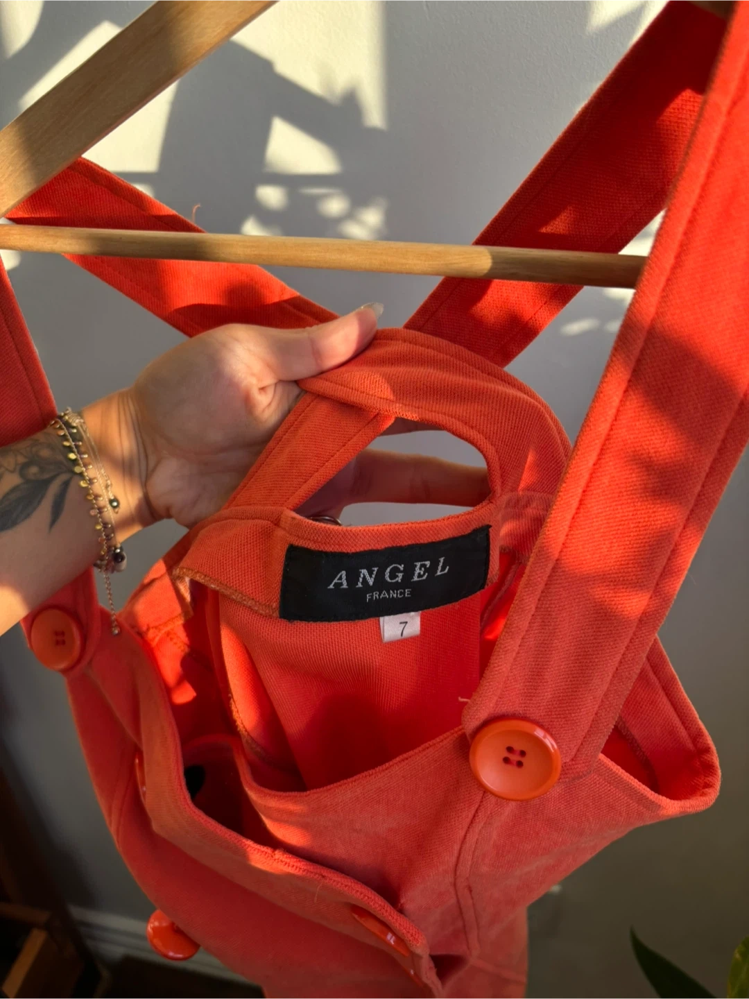 135Selling a cute orange dress from Angel France in size 7! It's in great condition and features a unique design with button details.