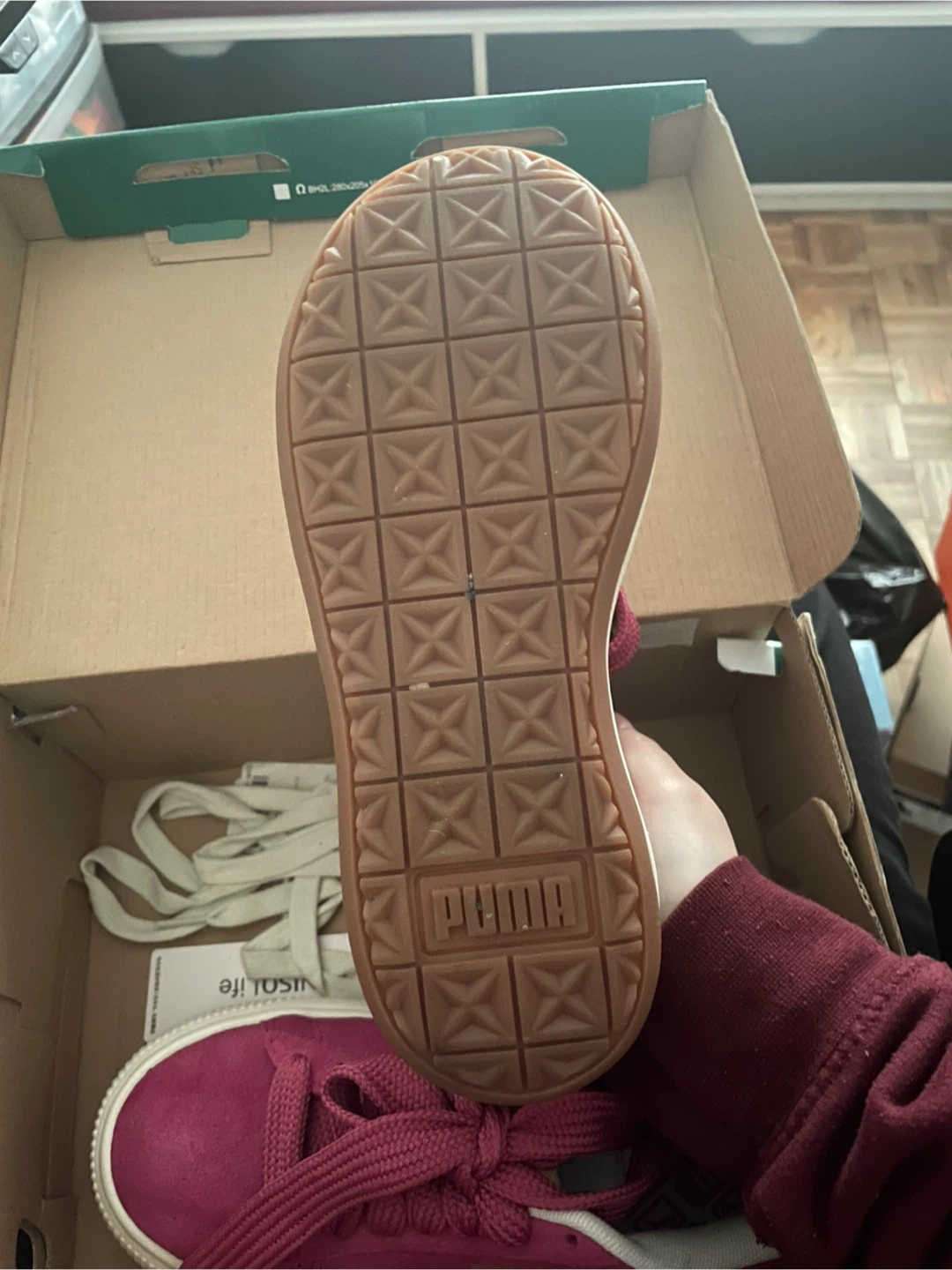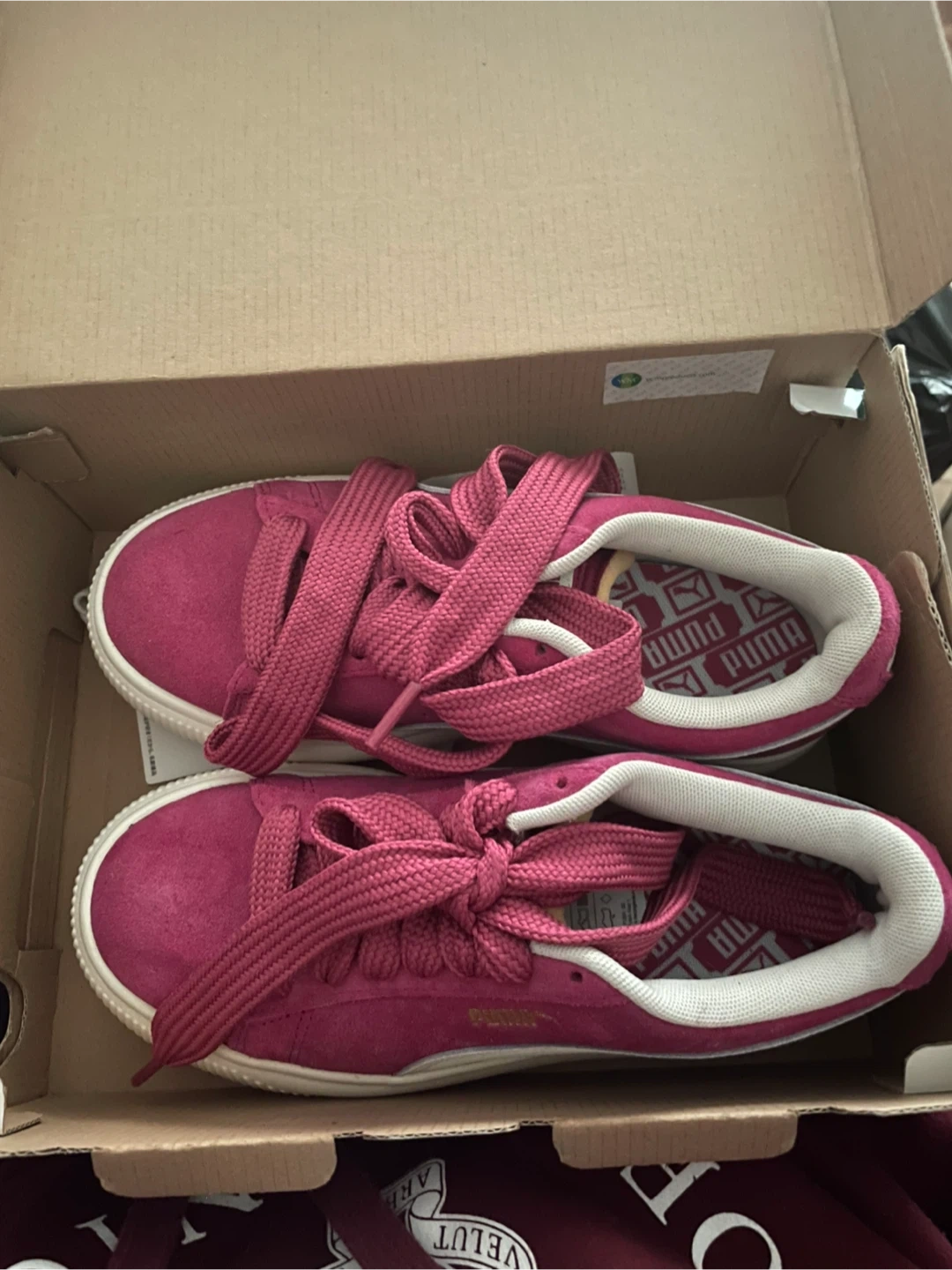 Selling a pair of Puma Suede Platform sneakers in a lovely raspberry colour! They're a size 6 and come with the original box. These shoes are in great condition and ready for a new home