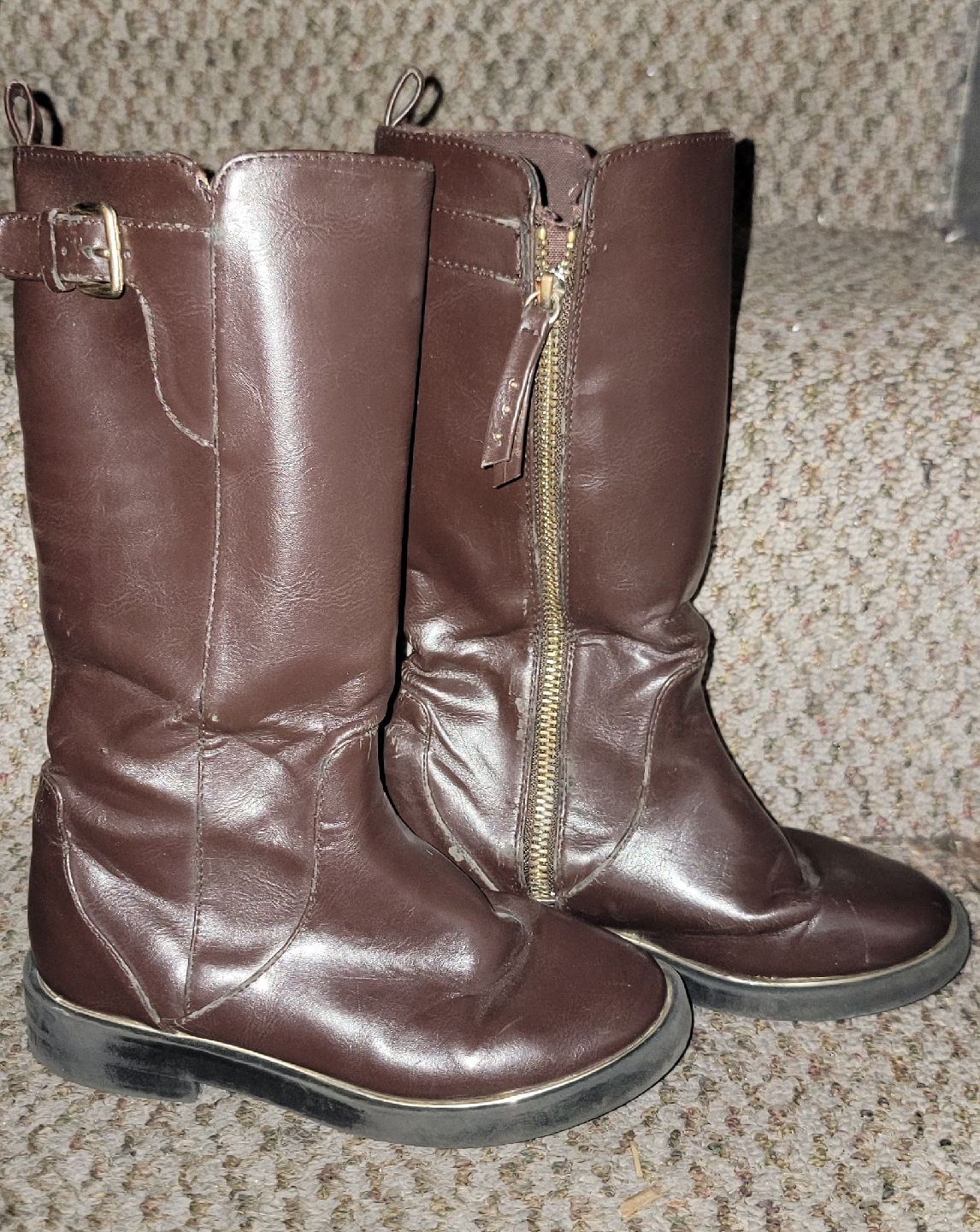 Selling a pair of brown knee-high boots. They have a zipper on the side and a buckle detail. They show some signs of wear, but still have lots of life left!