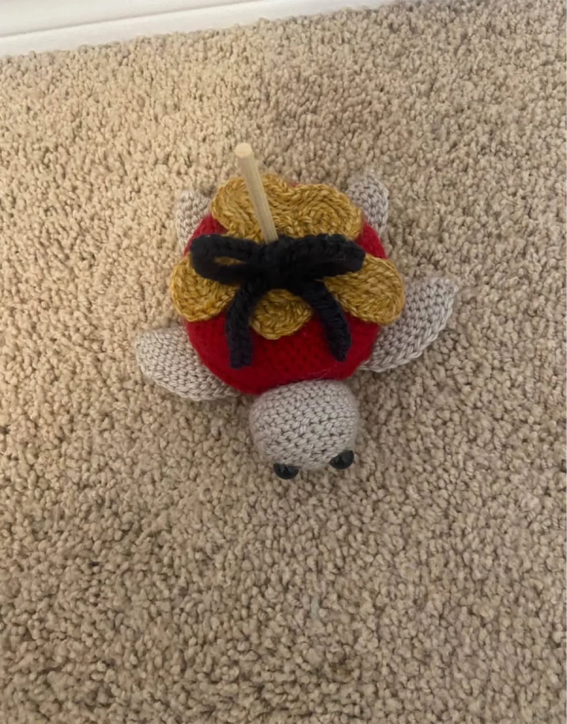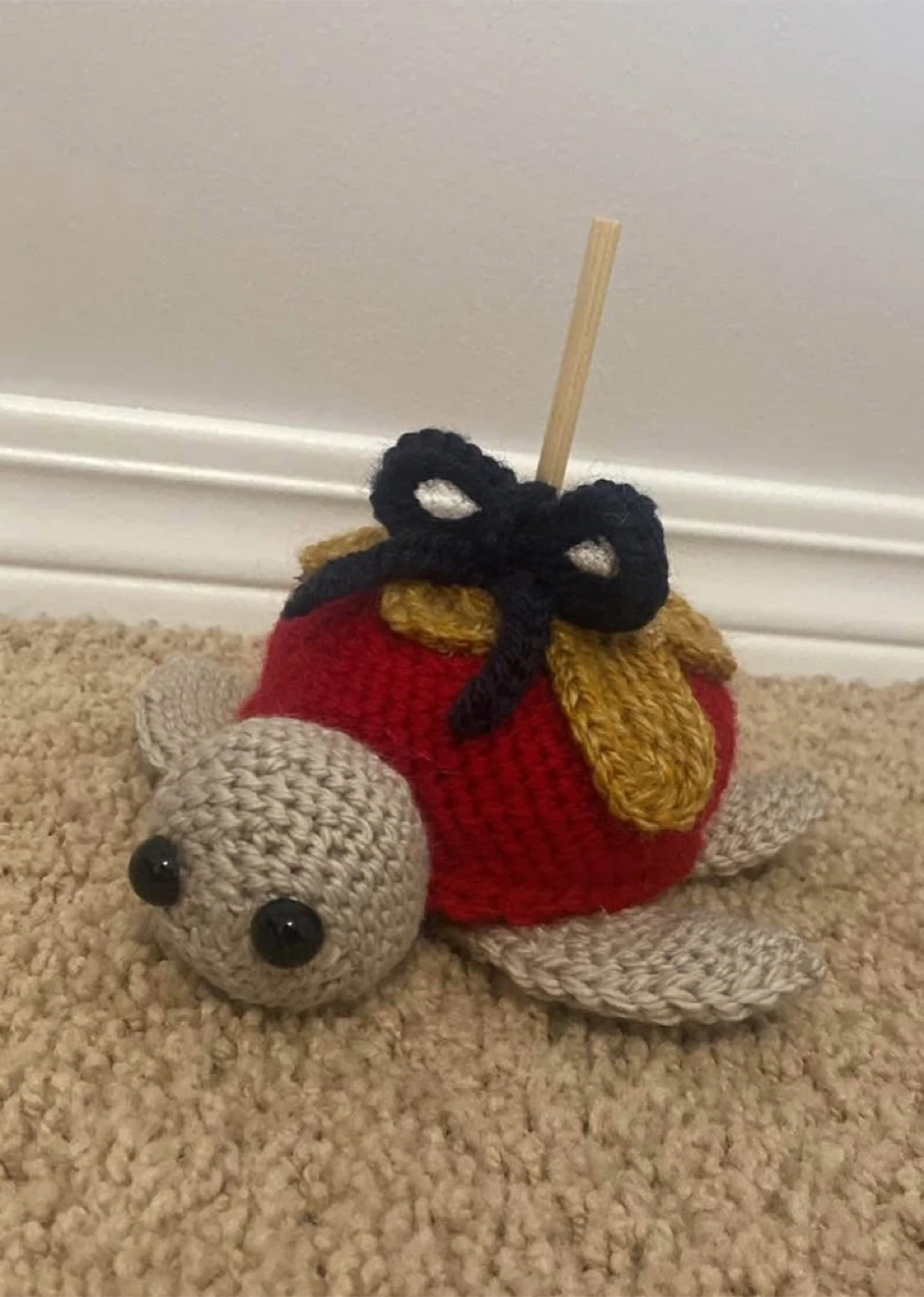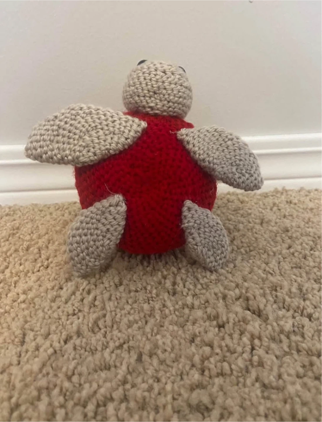 This is a cute, handmade Carmel apple turtle toy! It features a red body, grey head and flippers, and a decorative bow. Perfect for a child's room or as a unique gift and I only accept cash no online payment please