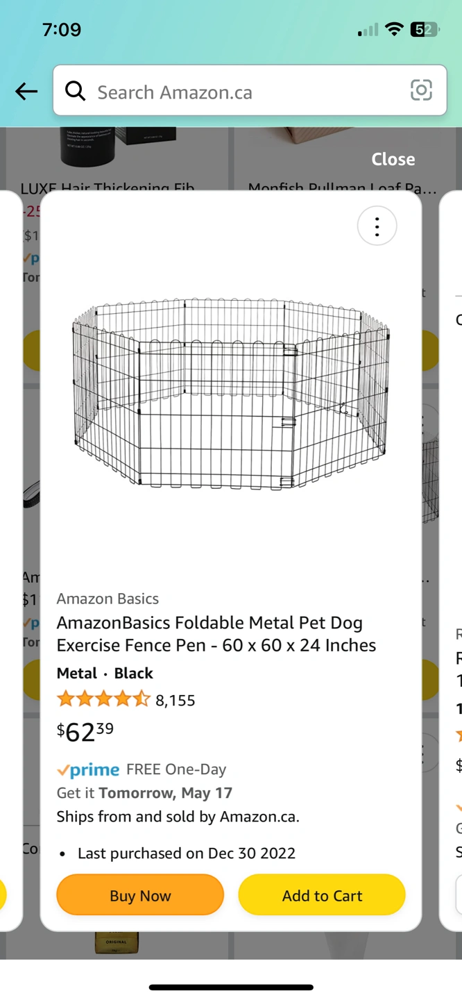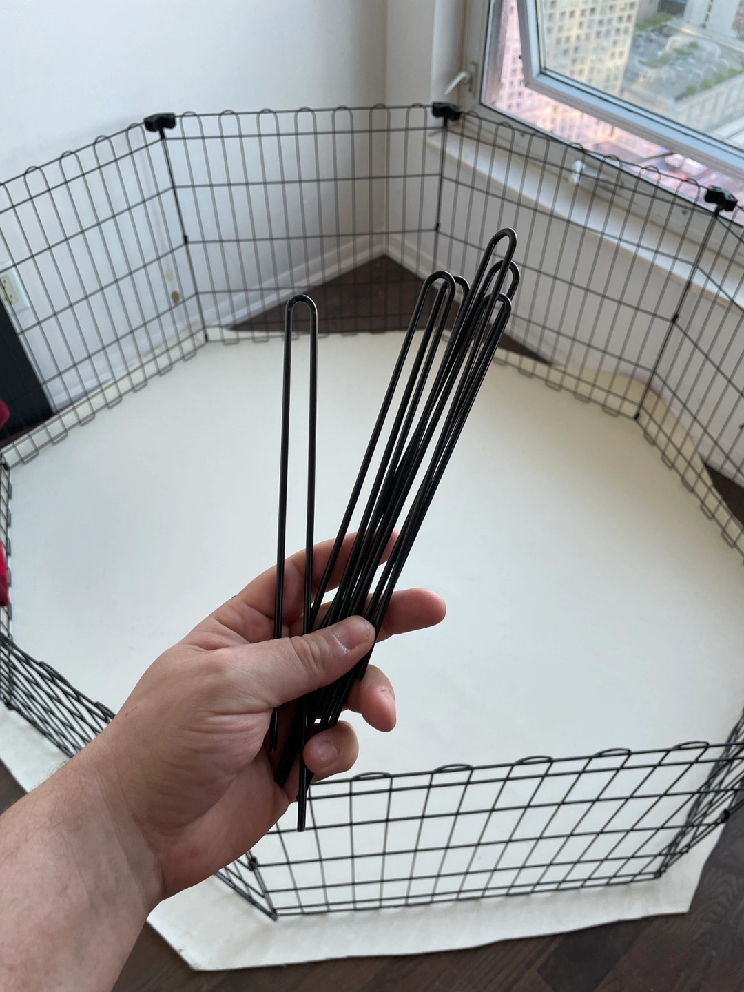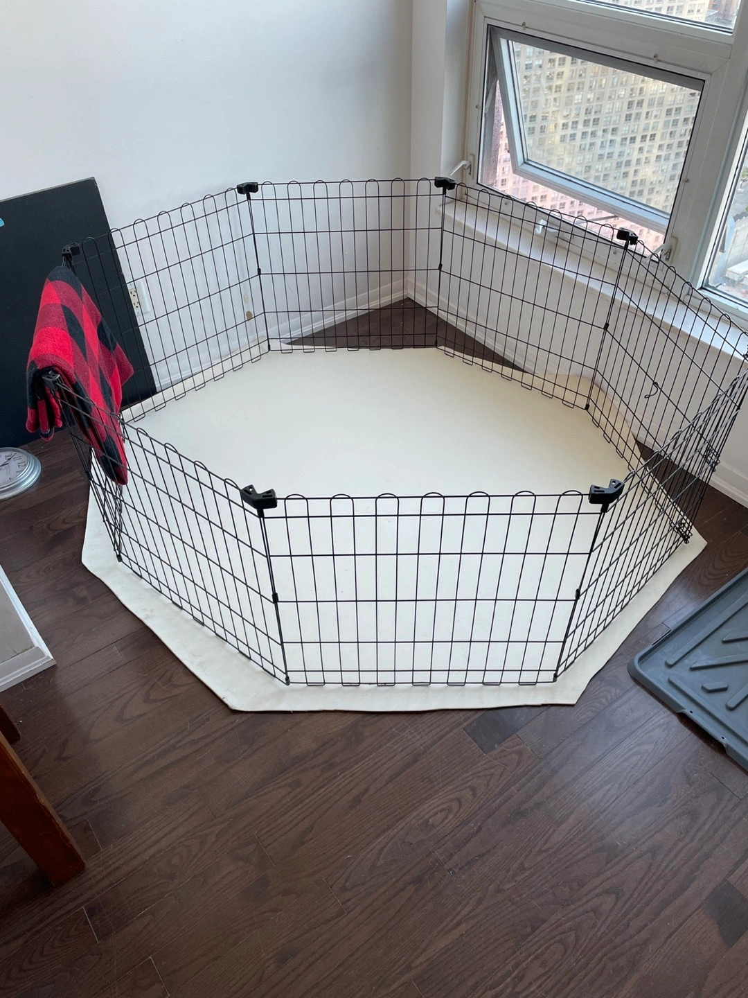 Gently used playpen for dogs. Got it from Amazon and have only been using during the day for 4 months. My pup no longer needs it. Still have the box for east pickup , comes with spikes so it can be used outside also. Excellent condition.I have a homemade mat made from thick durable vinyl to protect floors that you can also have if you wish. Makes for easy clean up especially while training.