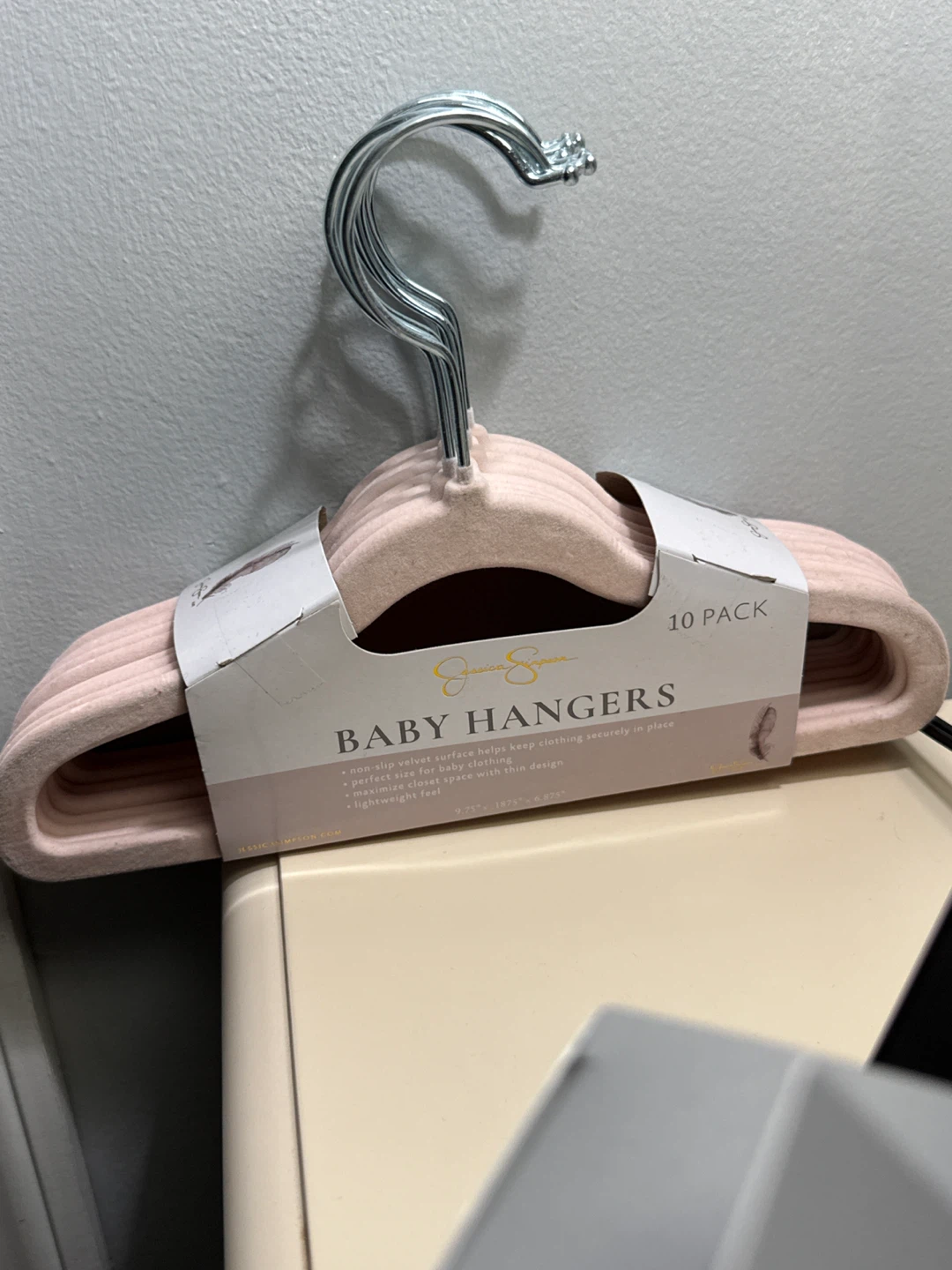 Selling a pack of 10 Jessica Simpson baby hangers! These hangers feature a non-slip velvet surface to keep clothing securely in place. They are the perfect size for baby clothing and maximize closet space with their thin design. They also have a lightweight feel