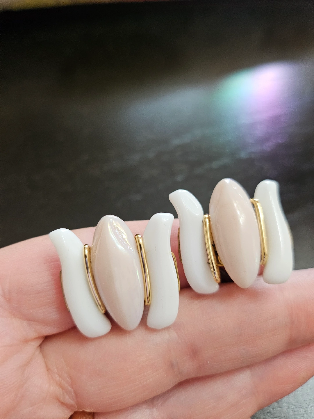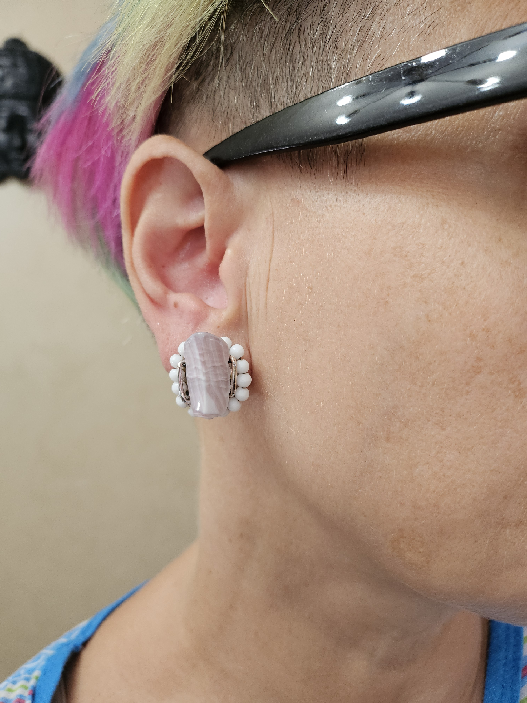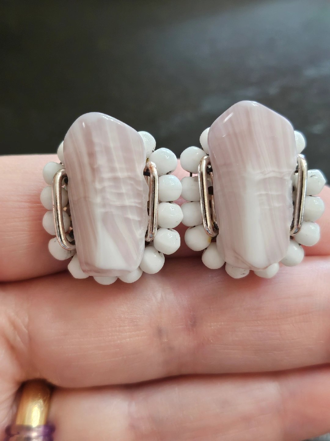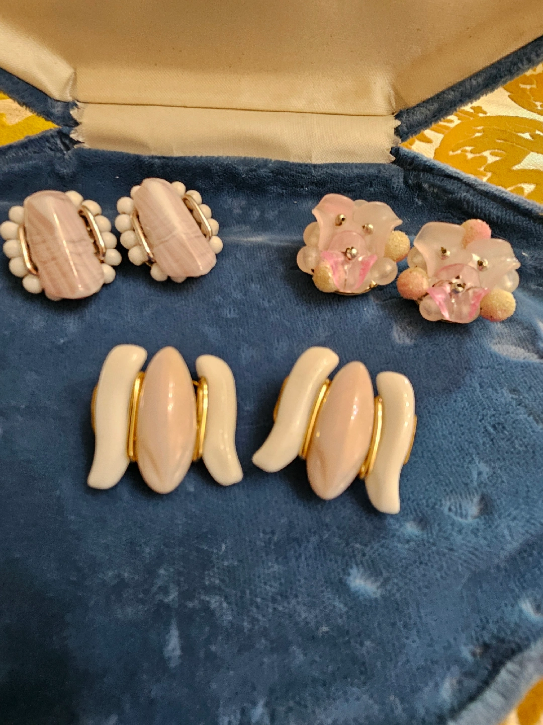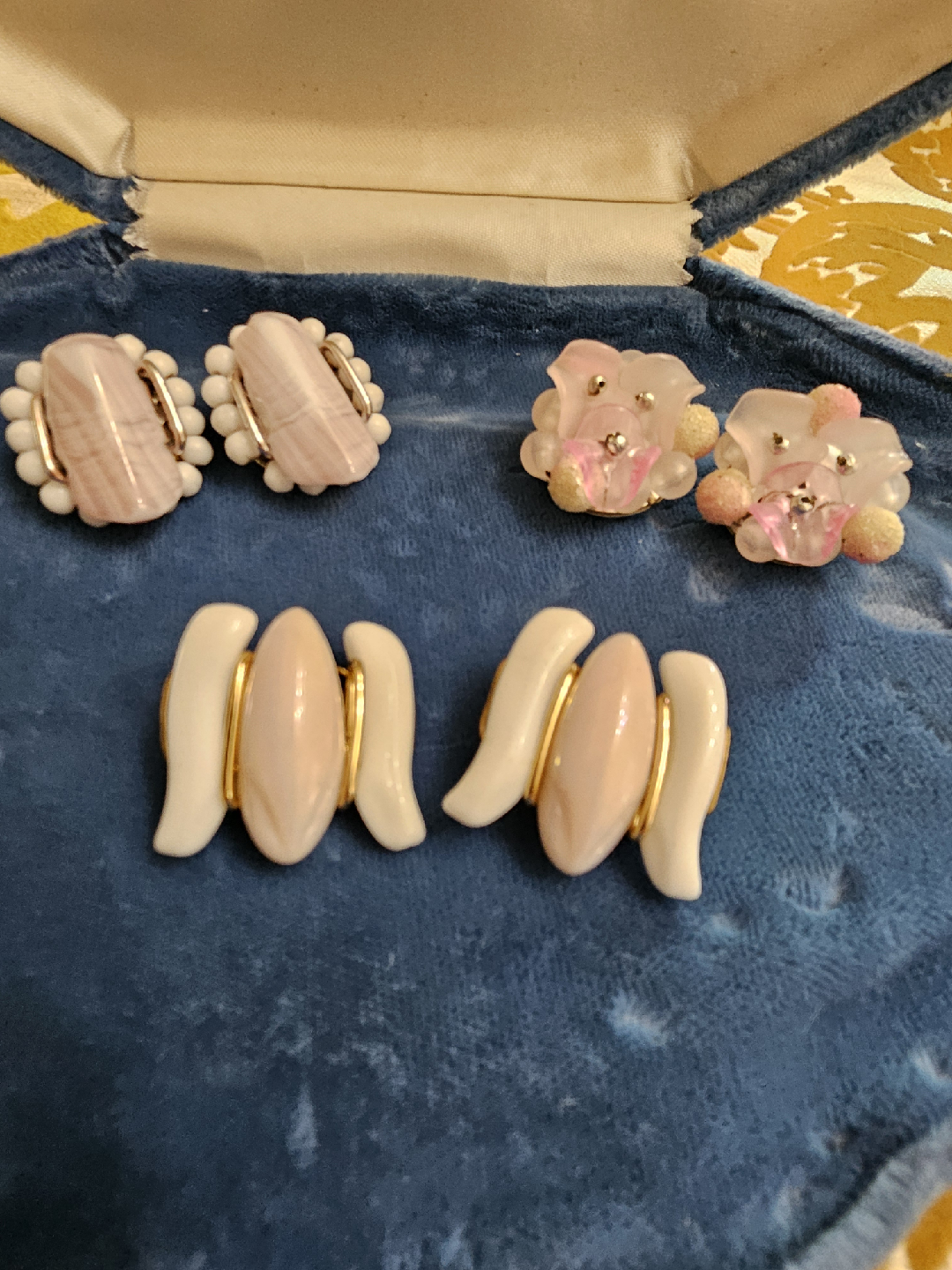 One pair is a striped stone with white beads, another is a white and gold design, and the third is a floral design.