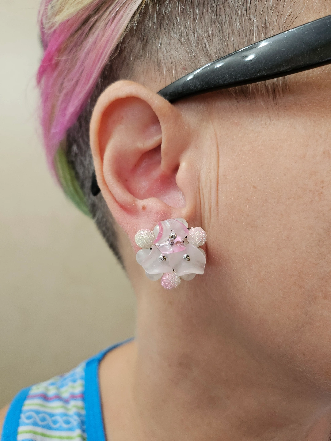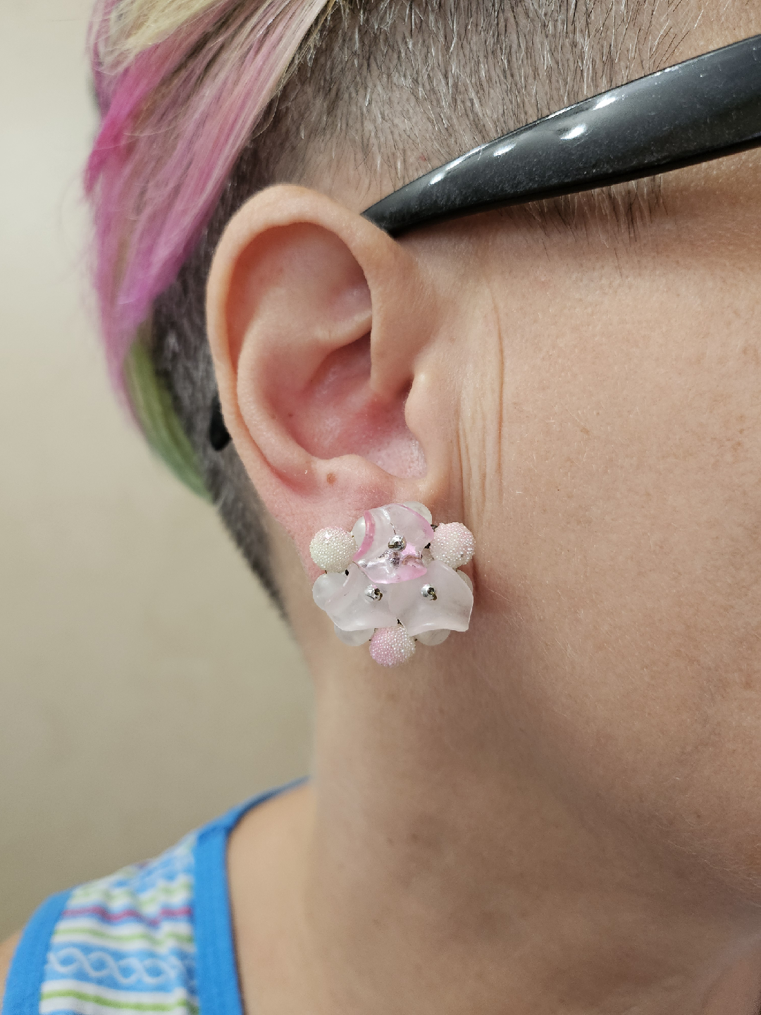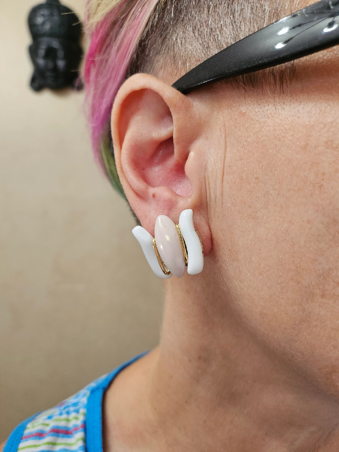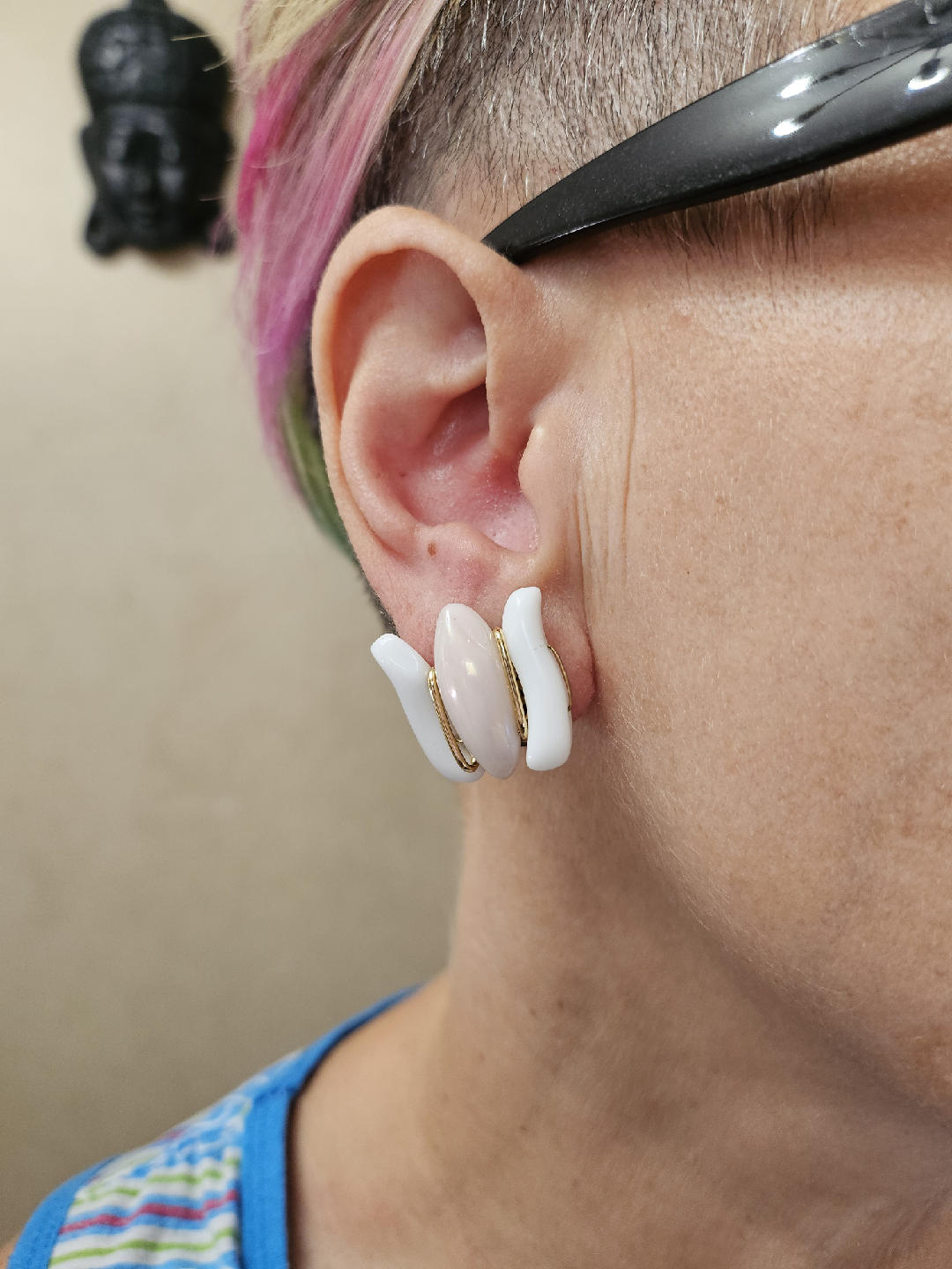 One pair is a striped stone with white beads, another is a white and gold design, and the third is a floral design.