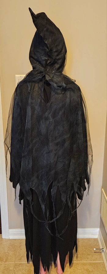 Very good/excellent condition, Soul Taker costume. Package shows size as large (12-14 years) but size is more suitable for 10-12 year old. Extra sizing information in attached picture. The costume includes a mask, hood, robe, and gloves. The black material that was covering the mask eye holes has been cut out for better vision. Milton pick up, cash only, no holds, price is as posted.