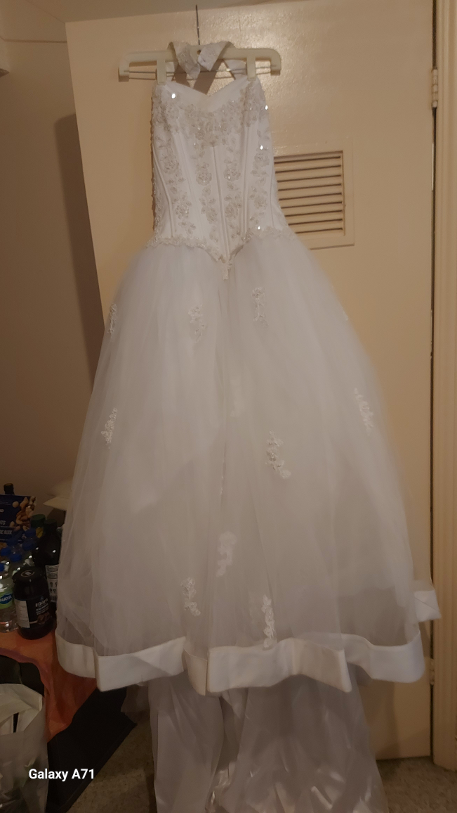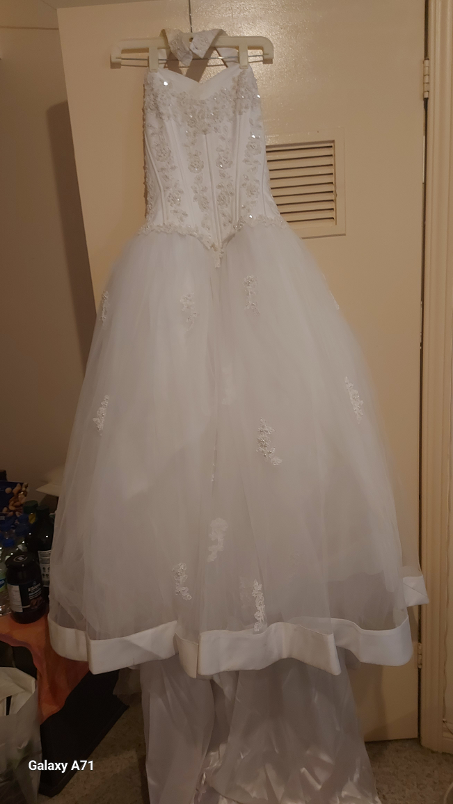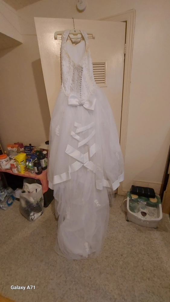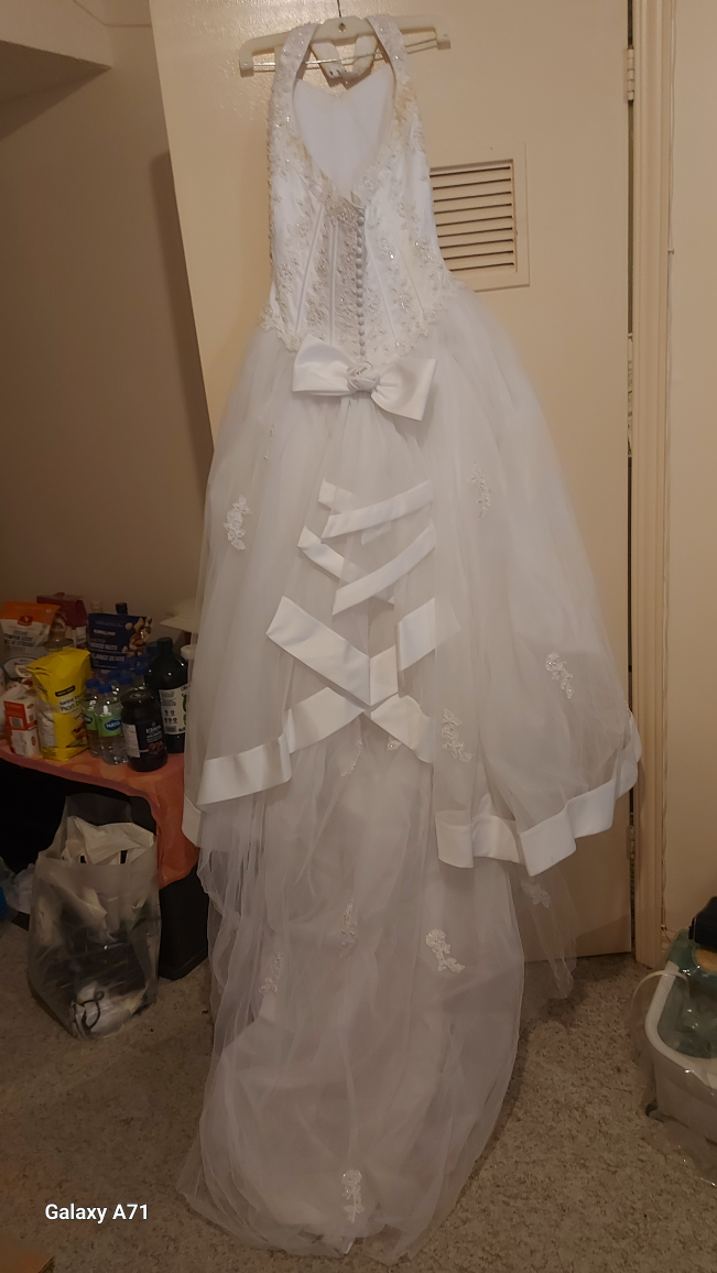 Selling a beautiful white wedding dress. It features a halter neckline, beaded bodice, and a layered skirt with bow accents. Perfect for your special day!