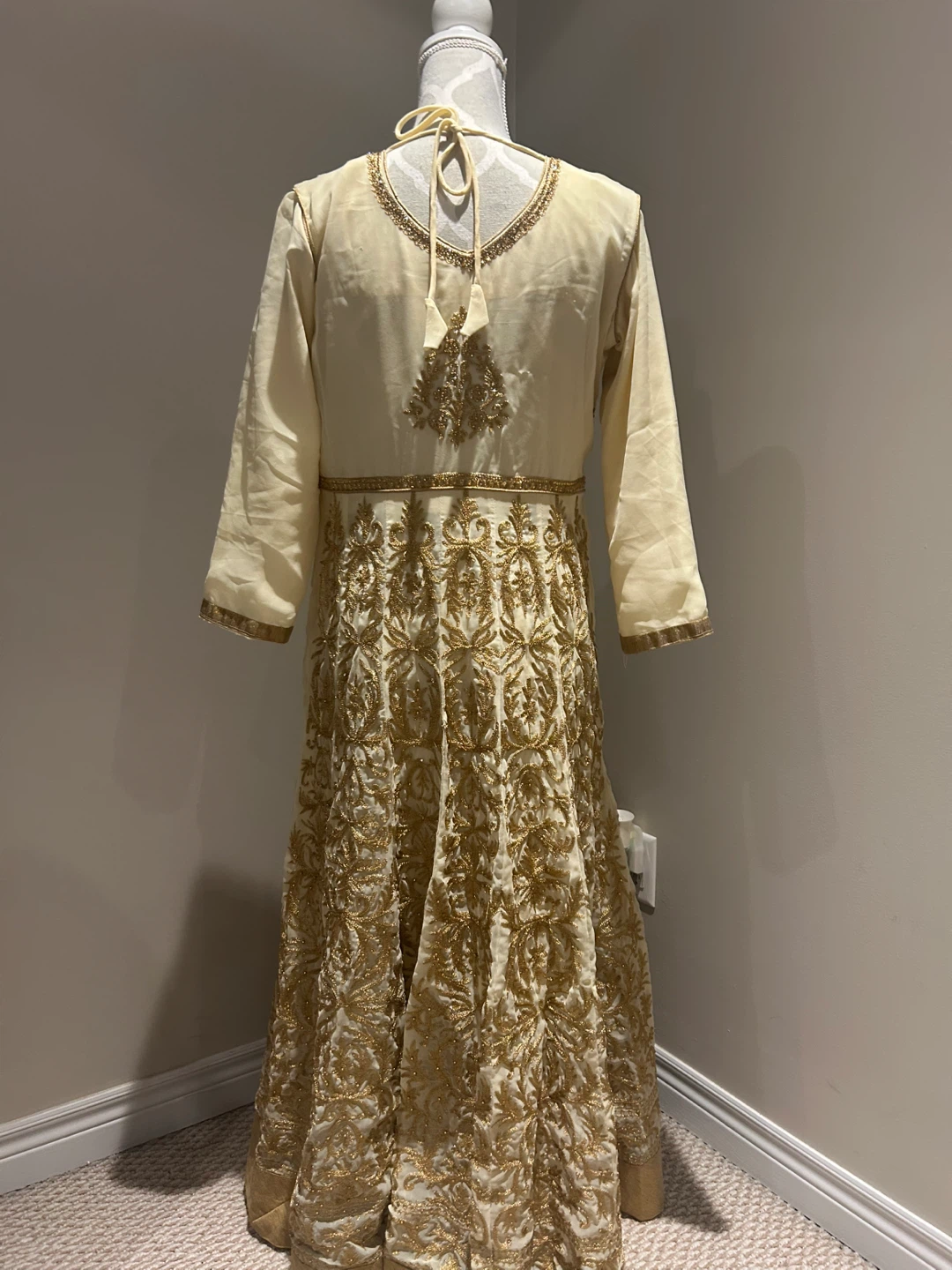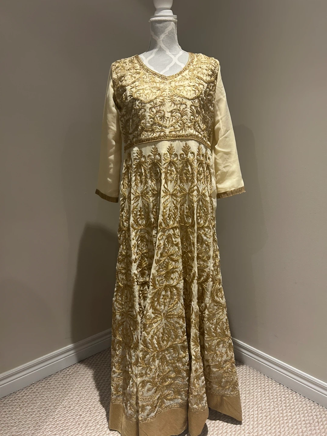 Beautiful cream and gold salwar kameez with intricate embroidery. Perfect for a special occasion! It's in excellent condition and ready for a new home.