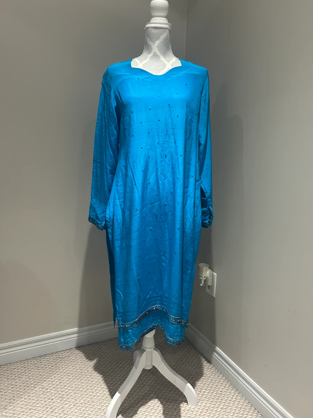 Here's a beautiful teal blue salwar kameez. It's in great condition and ready for a new home. The colour is a vibrant teal blue. It would be a great addition to any wardrobe