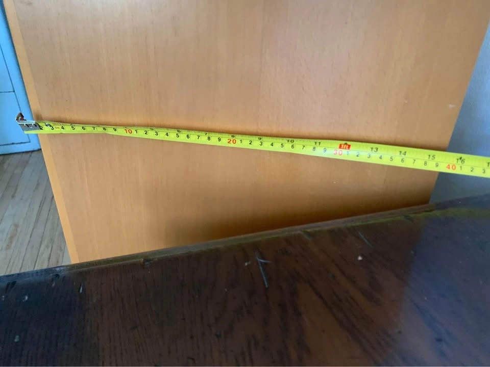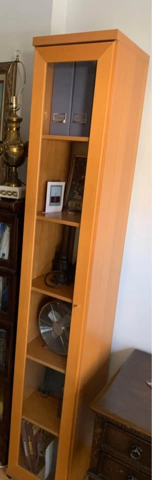 Tall solid Ikea bookcase with 6 adjustable shelves and a solid glass door. Excellent shape and condition. I can’t remember the line’s name, but it is not the Billy line. It's deeper and more solid. Dimensions: 14”(36cm) x 15 1/2”(39cm) x 86”(219cm).