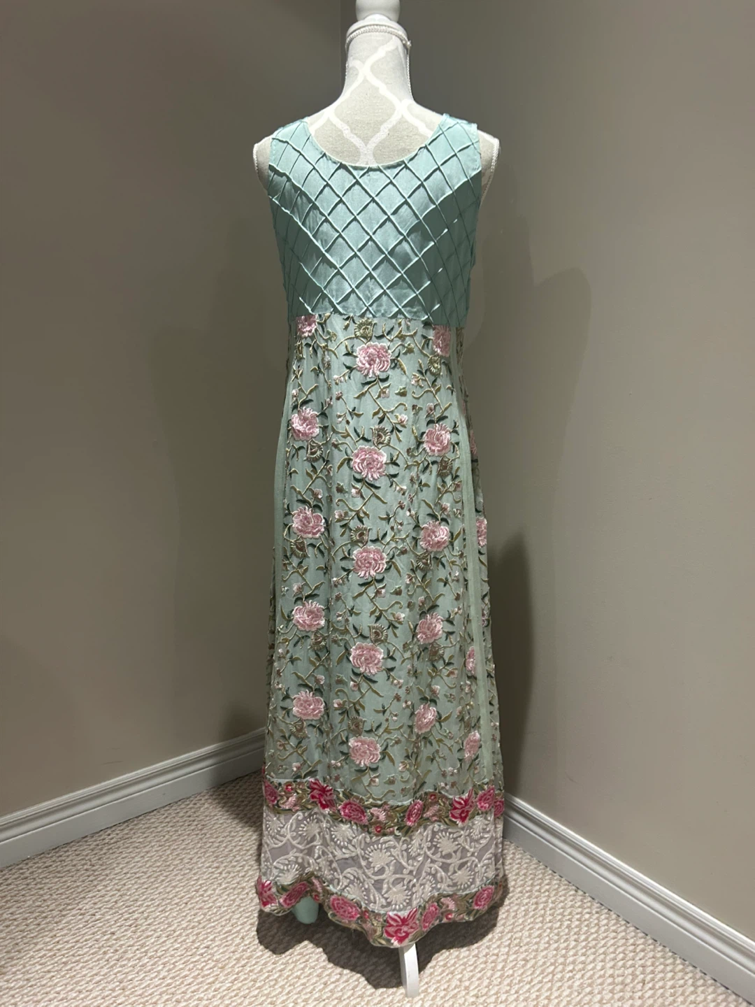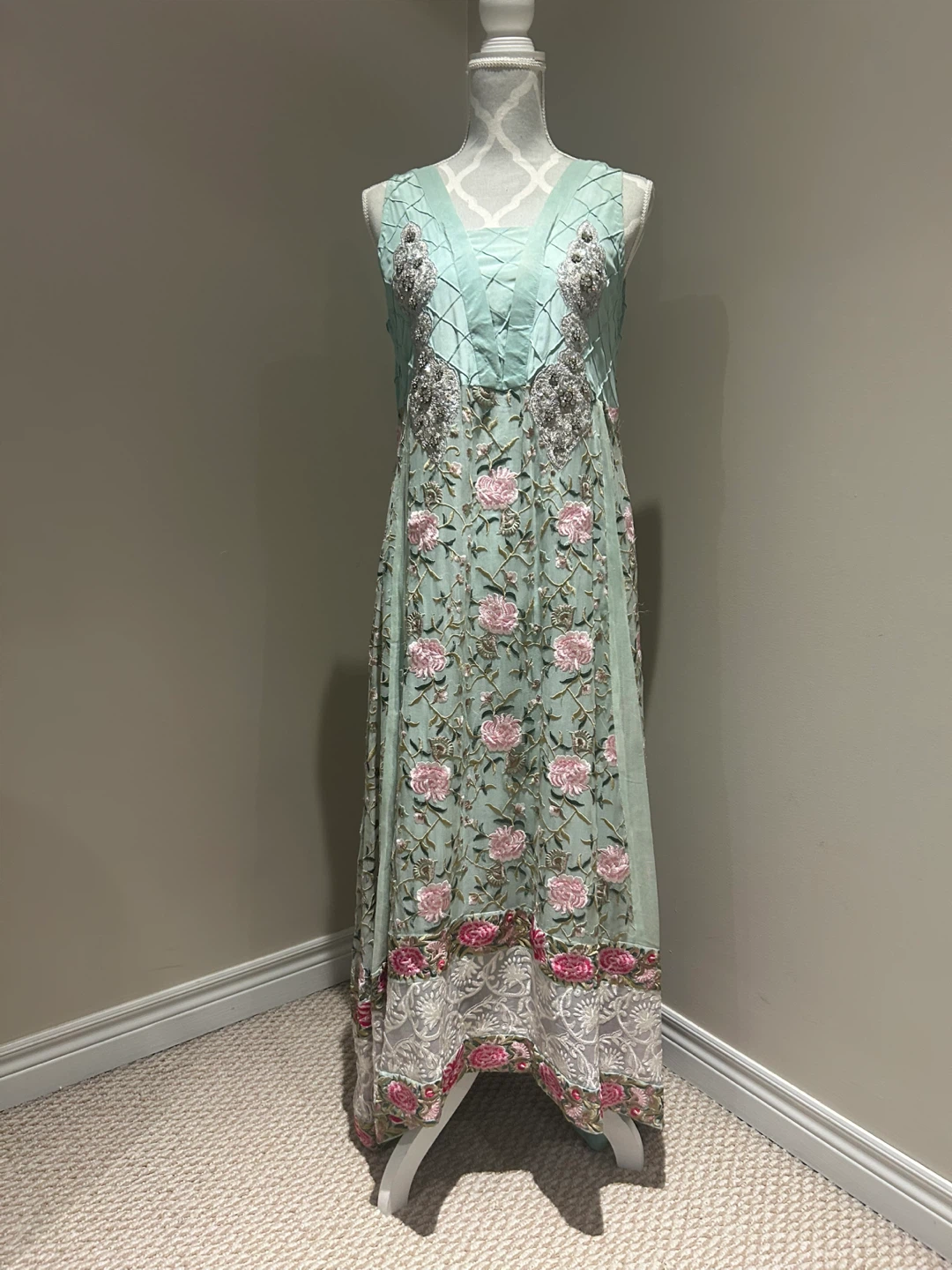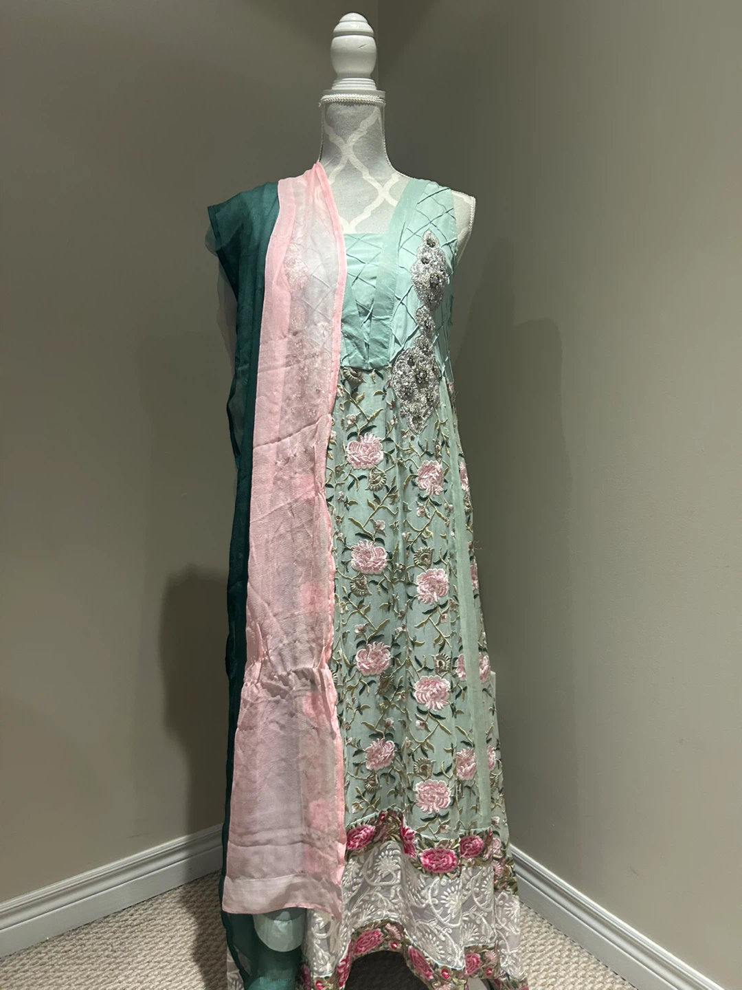 Beautiful dress with intricate floral embroidery! It comes with a matching shawl and Salwar to complete the look. Perfect for special occasions or adding a touch of elegance to your wardrobe