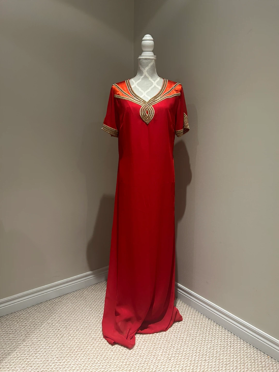 Beautiful red maxi dress with gold embroidery detailing! Perfect for a special occasion or just feeling fancy. The dress is in great condition and ready for a new home. It's a lovely shade of red that really pops!