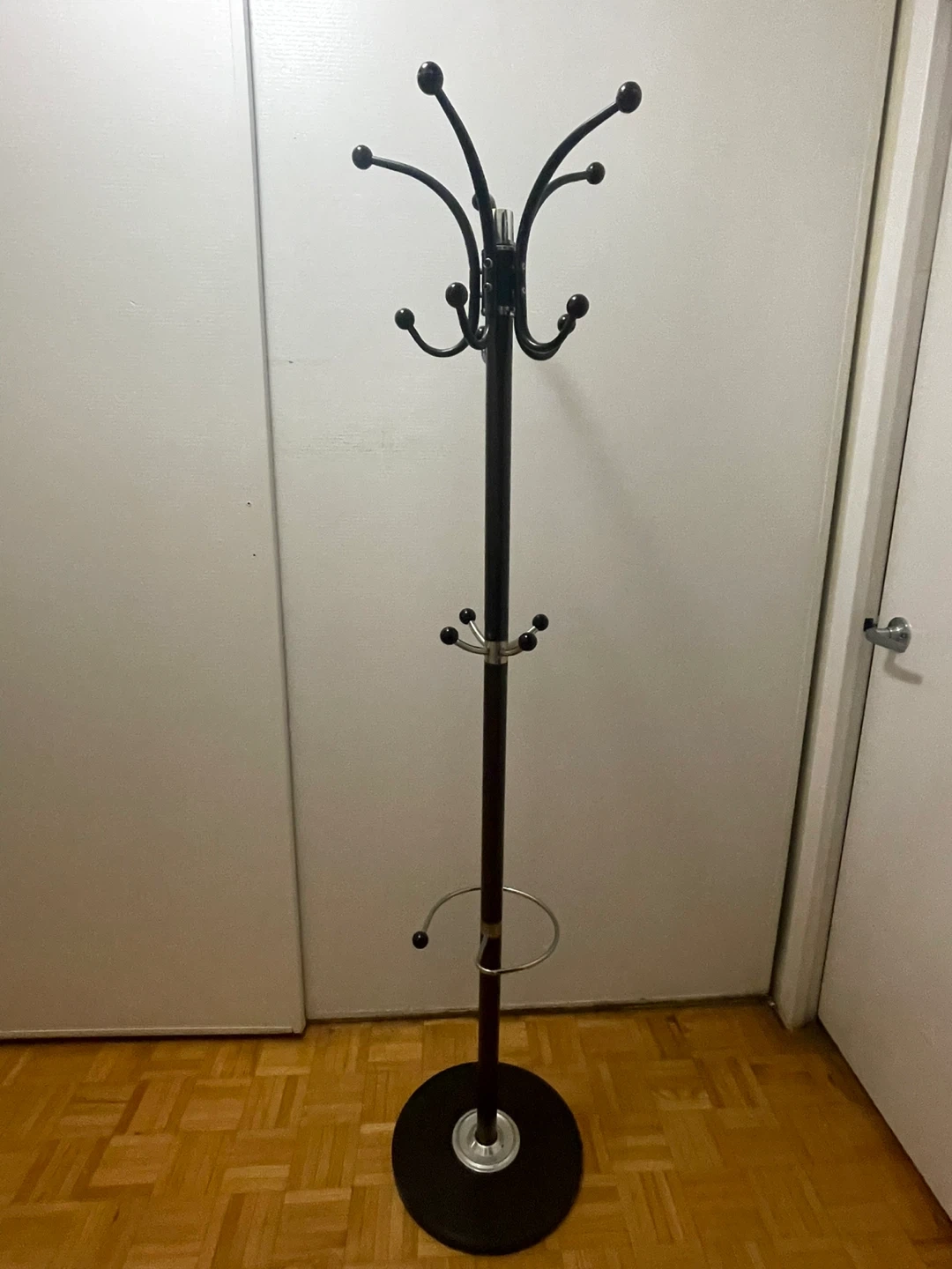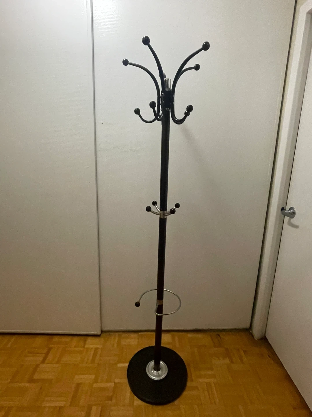 I'm selling a coat rack stand. It's perfect for keeping your coats, hats, and umbrellas organized. It’s in great condition and ready for a new home