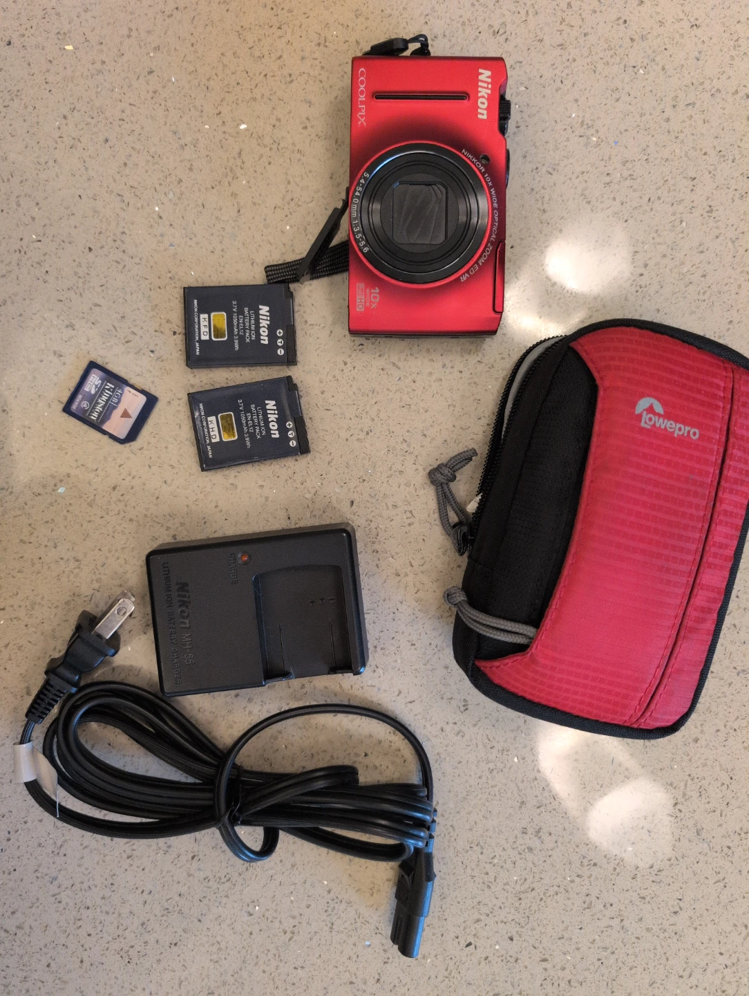 Comes with 2 original nikon batteries and a charger, and small camera bag.