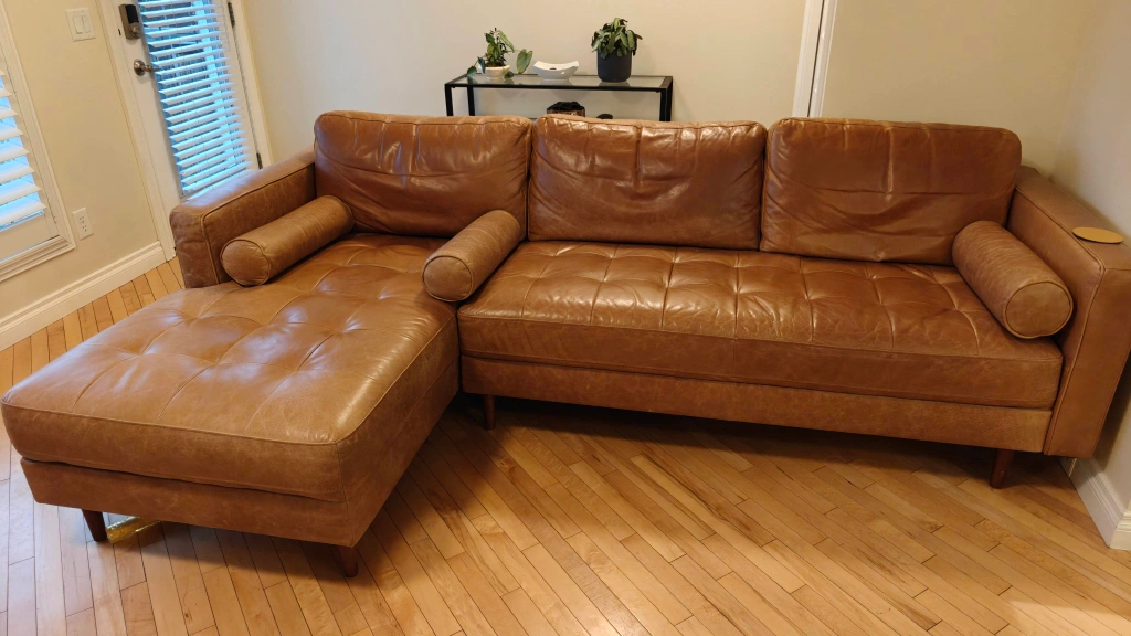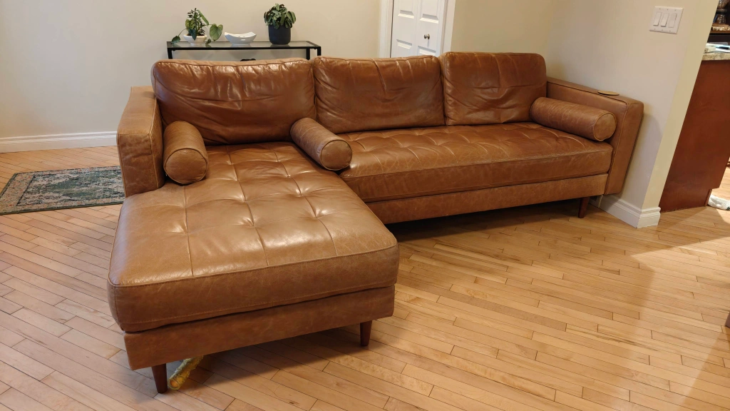Selling a beautiful Structube Kinsey sectional sofa in the caramel leather finish. It's in good condition and ready to add a touch of mid-century modern style to your living room. The leather is soft and comfortable, perfect for lounging. This sofa is a real statement piece! Pickup only.