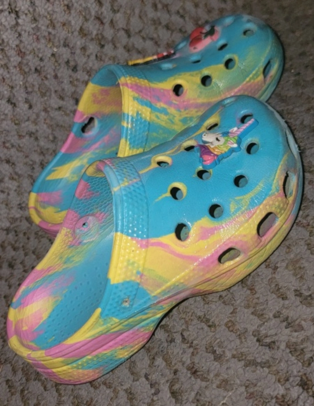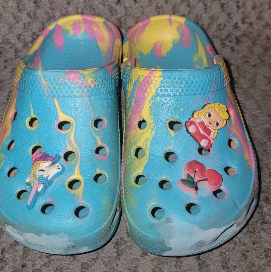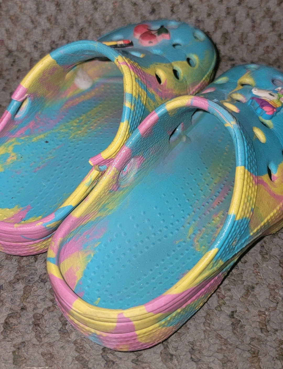 These fun Crocs are perfect for your little one! They're a kids' size 9 and feature a cool tie-dye pattern in shades of blue, pink, and yellow. They also have some cute jibbitz attached, including a unicorn, a princess and cherries. These clogs are well-loved and ready for a new adventure! pick up location Royal York and