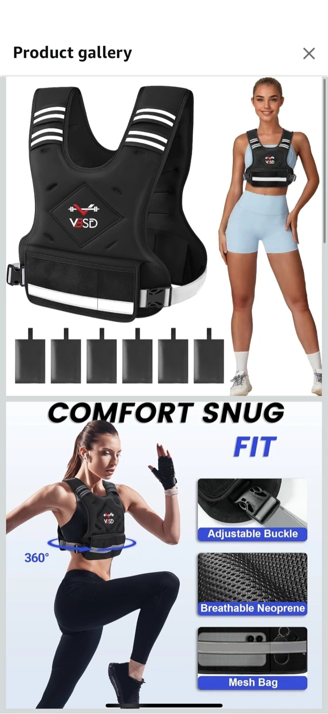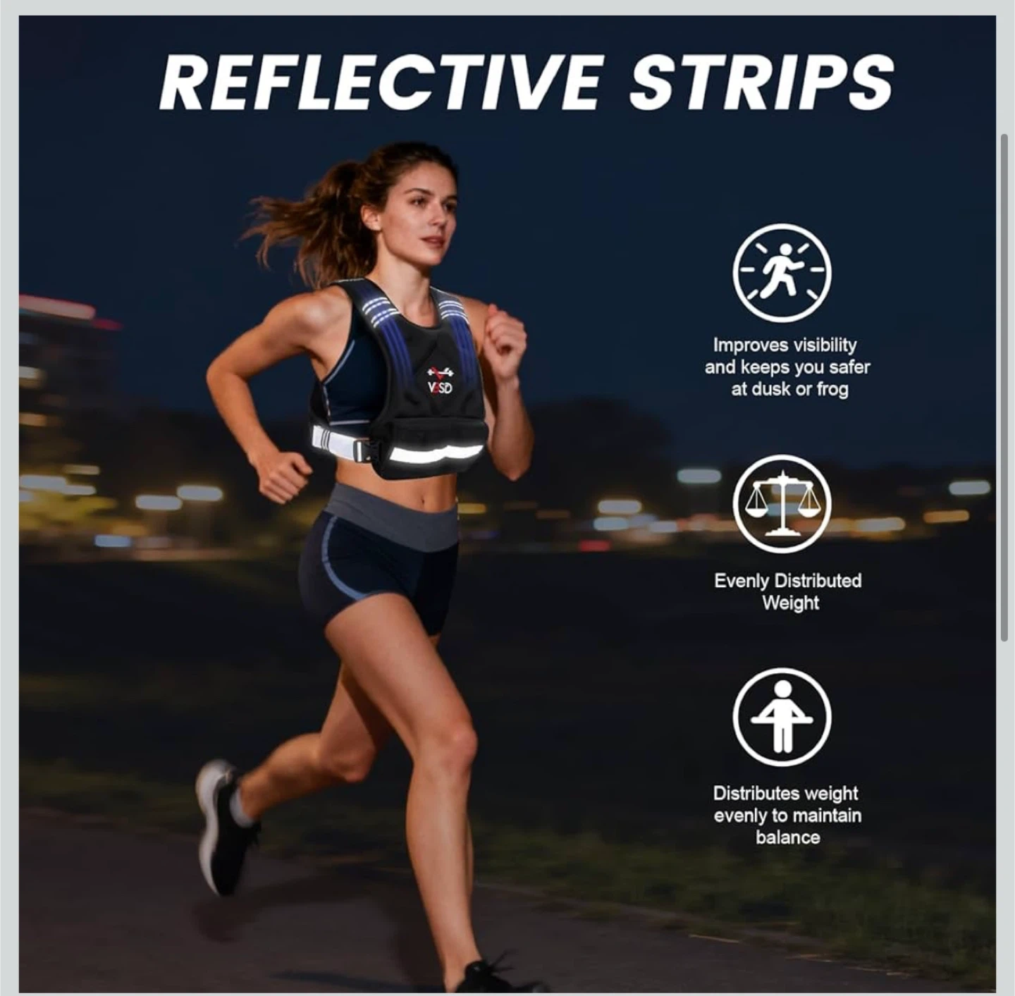 Get ready to level up your fitness routine with this VSD adjustable weighted vest! It's designed for comfort and a snug fit, making it perfect for various activities like jogging, cycling, and squats. The vest features breathable neoprene and an adjustable buckle for a secure fit. It also has reflective strips to improve visibility during dusk or dawn, and mesh bags for convenience. The weight can be adjusted from 20 to 32 lbs using the six 2lb ironsand weights.