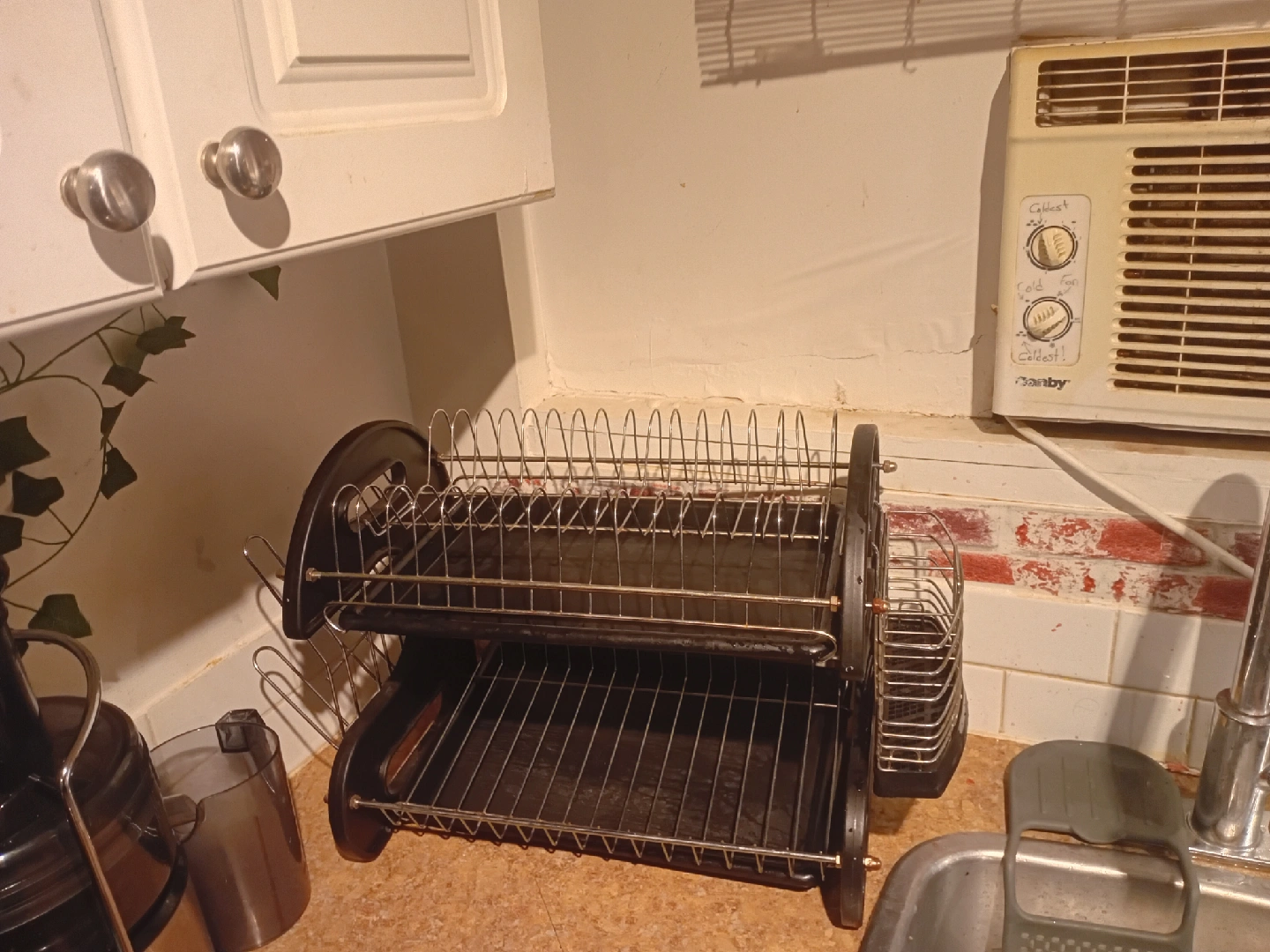 Selling a black dish rack, perfect for keeping your dishes organized and dry! It has two tiers for maximum storage and 2 side compartments for utensils,cups, mugs, and glasses