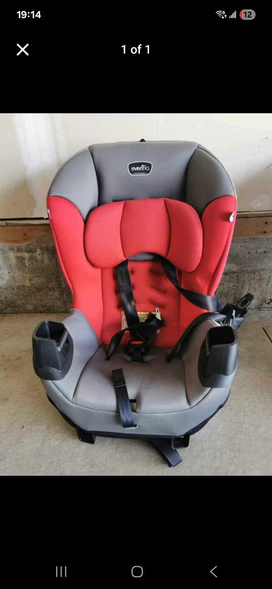 Selling an Evenflo car seat in good condition! It's grey and red, and has two built-in cup holders. Perfect for keeping your little one safe and comfy on the road.