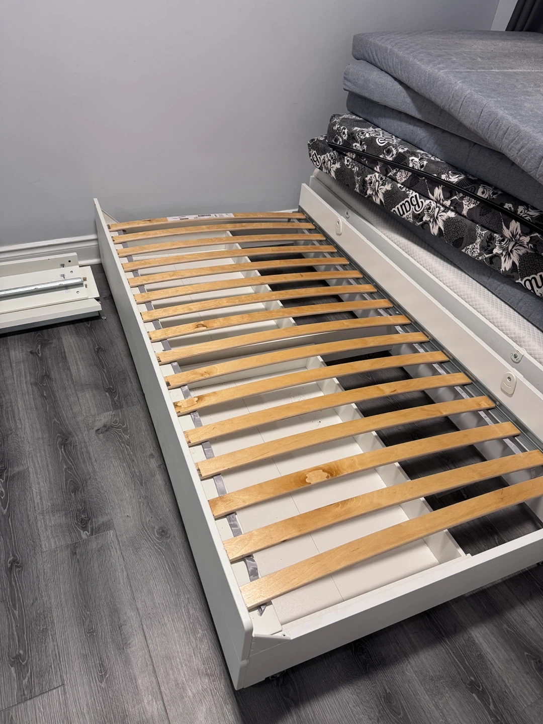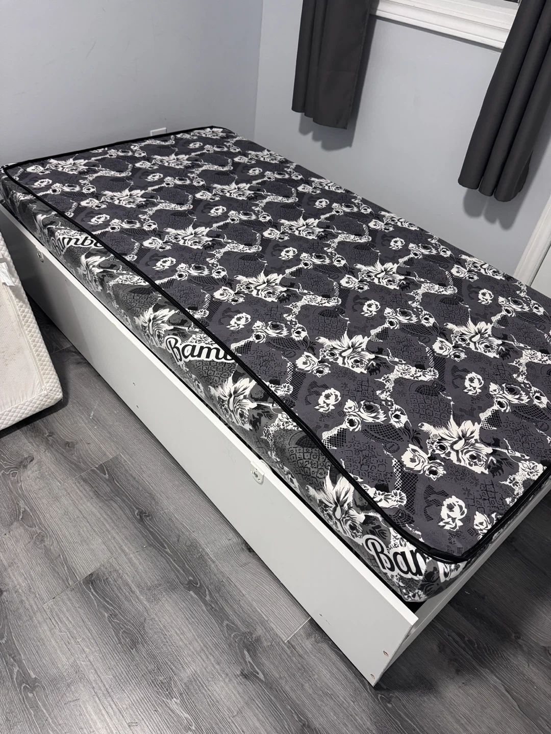 9- Selling Bambi Twin Size Mattress + Bed Frame Stylish grey and white floral pattern mattress in good condition, clean and comfortable - Comes with a white twin bed frame ready to use right away. (50$ and pickup only) - I have 4 twin sets available (price is for mattress + bed frame together). Perfect for students, guest rooms, or rental spaces.
