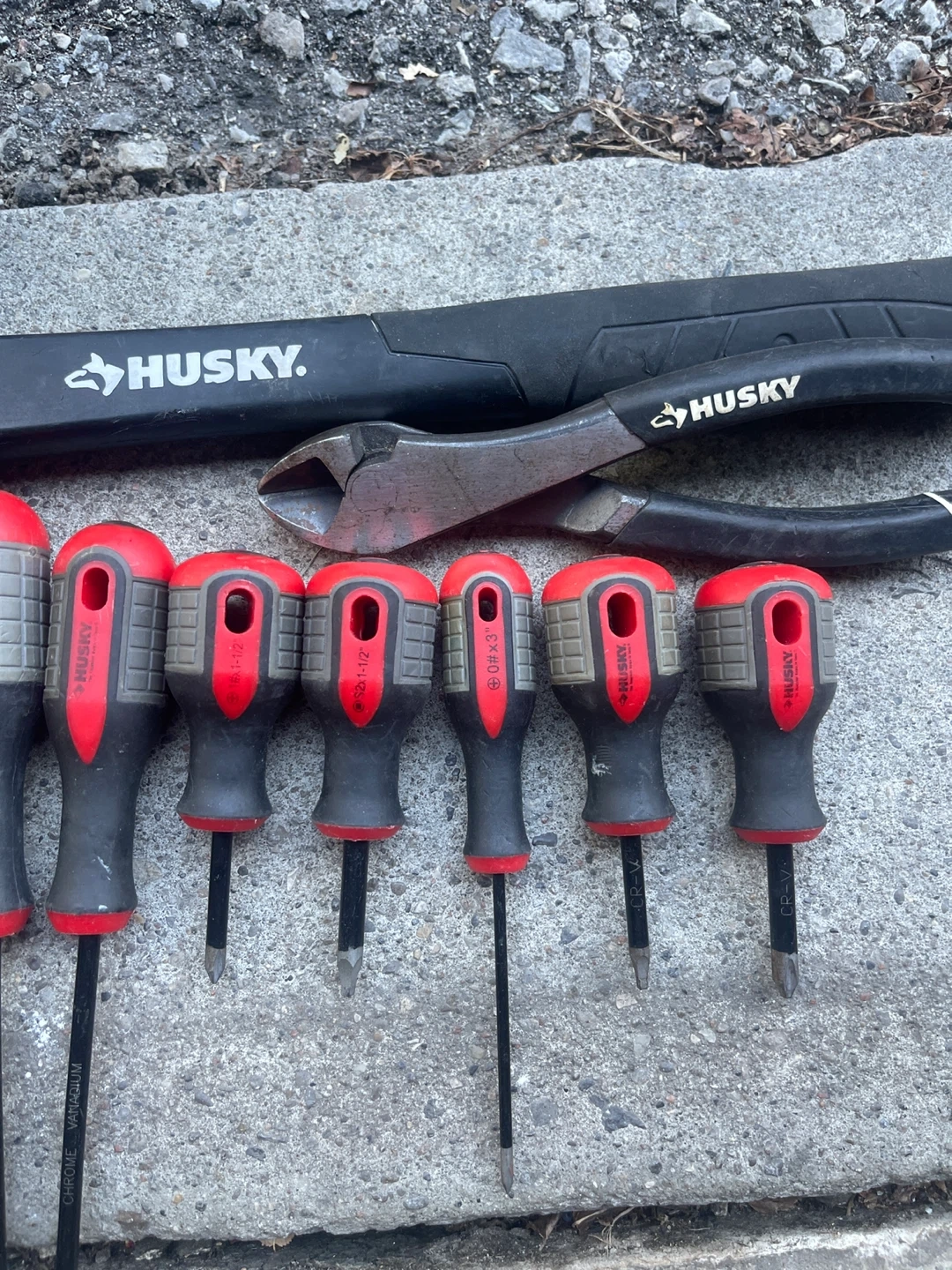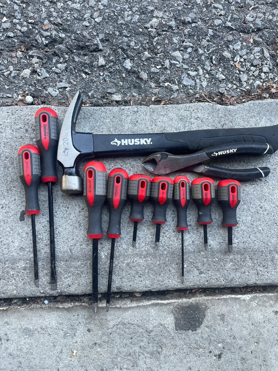 Selling a Husky tool set that includes a hammer, a variety of screwdrivers, and pliers. Great for any DIY projects around the house!