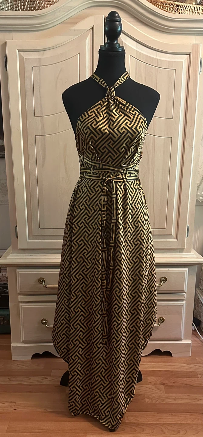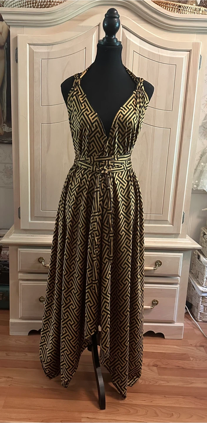 Unique Change it up dress. Different ways to wear it. With a striking gold and black geometric pattern. It has a flattering wrap style with a tie at the waist. Perfect for a special occasion or a night out! Or a beach cover up. Bought in The Mayan Riviera.