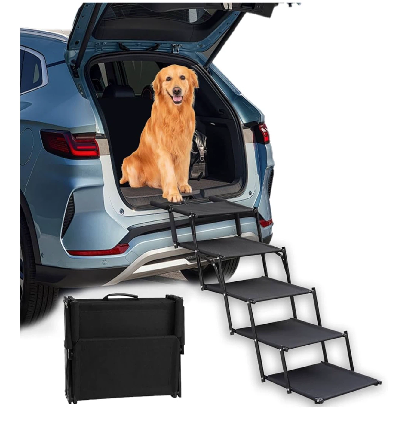 These portable folding dog stairs are perfect for helping your furry friend get in and out of the car! The stairs feature extra-wide steps for your dog's comfort and horizontal steps to reduce joint stress. They are stable and safe, with a non-slip fabric. The stairs also have a soft foam handle to prevent scratching your car's paint and a safety buckle to prevent shaking.