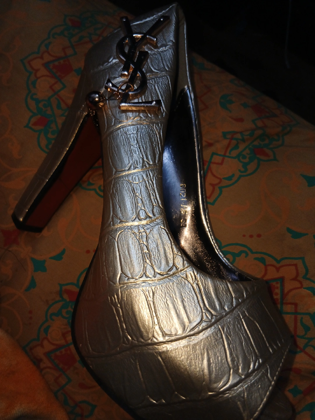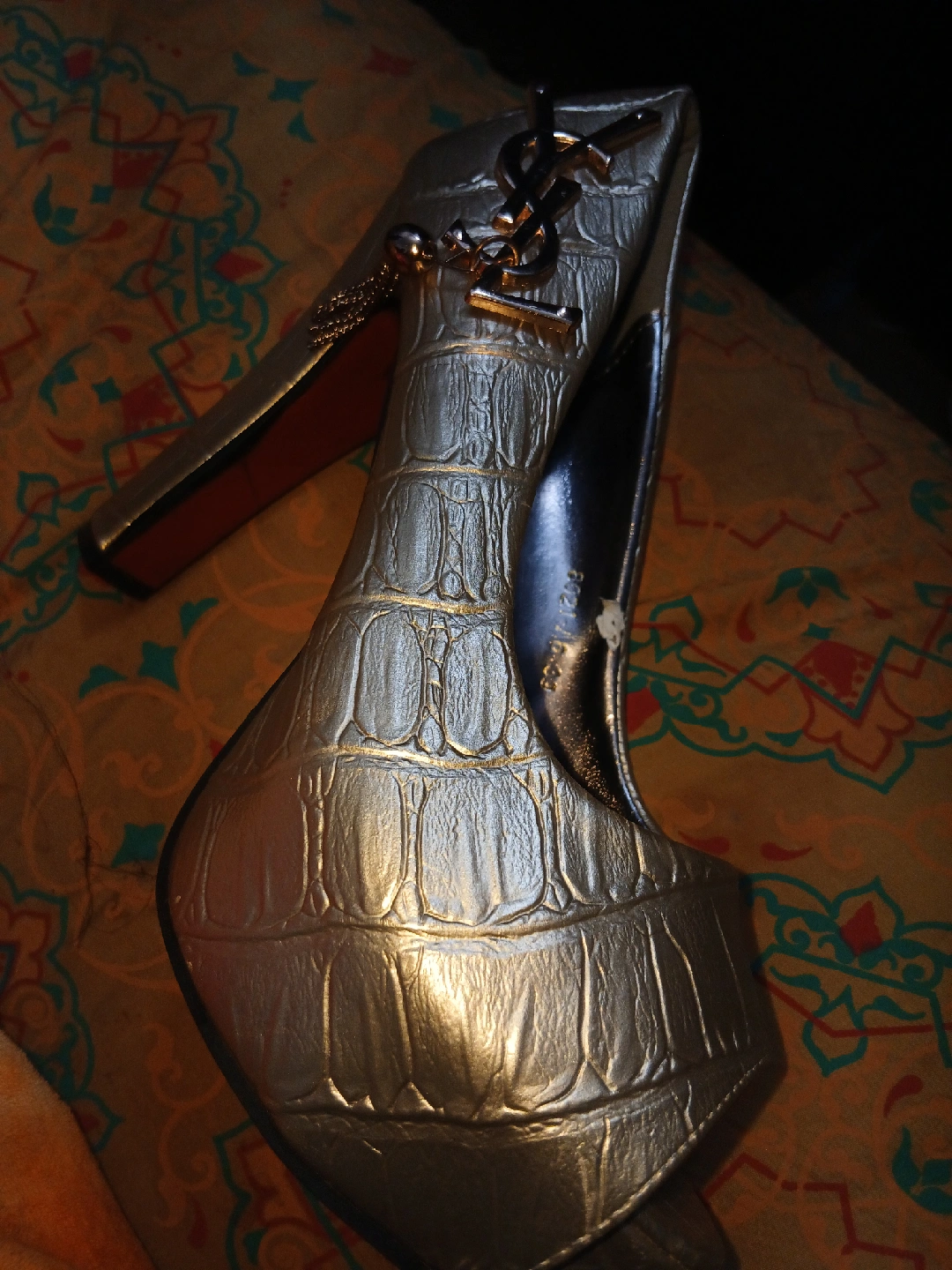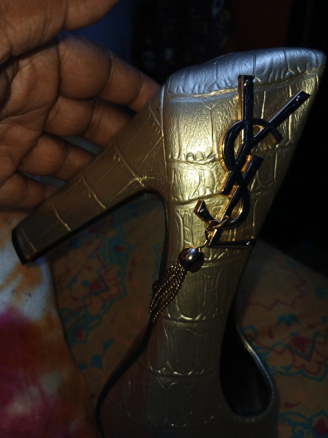 25Selling a pair of Yves Saint Laurent (YSL) gold heels. They are a size 8.5. These heels have a unique design with the YSL logo on the side. They are in good condition and ready for a new home