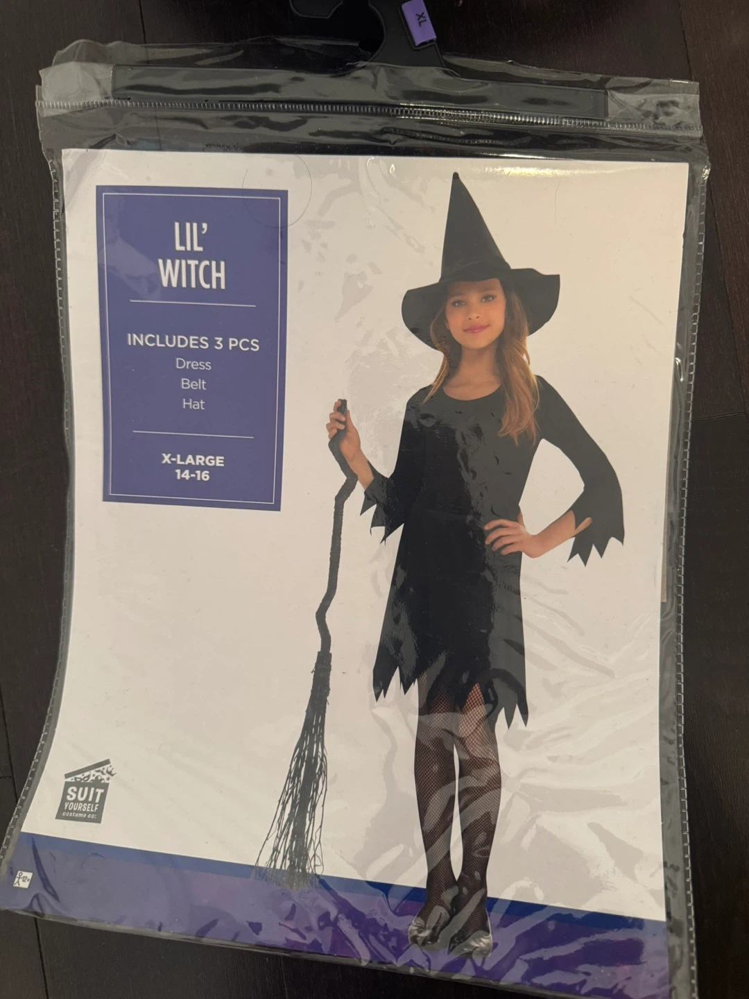 15Selling a Lil' Witch costume, perfect for Halloween or dress-up! This costume includes three pieces: a dress, a belt, and a hat. It's an X-Large size, fitting sizes 14-16.