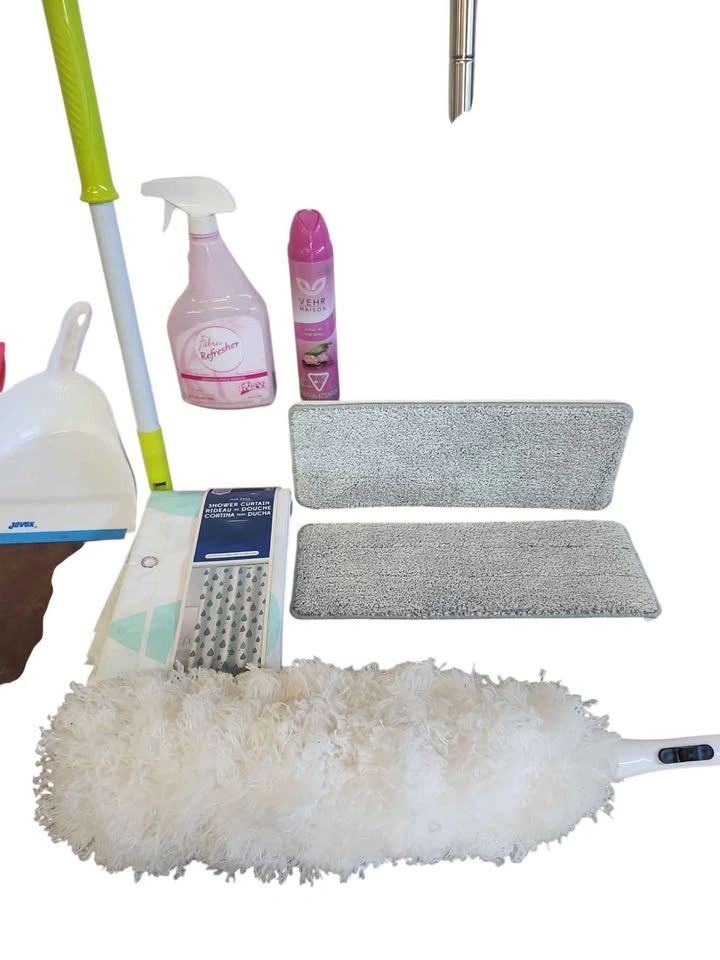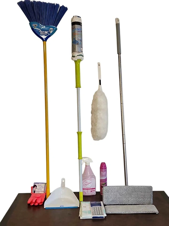 This collection suggests a comprehensive set of tools for various cleaning tasks, including sweeping, mopping, and dusting.