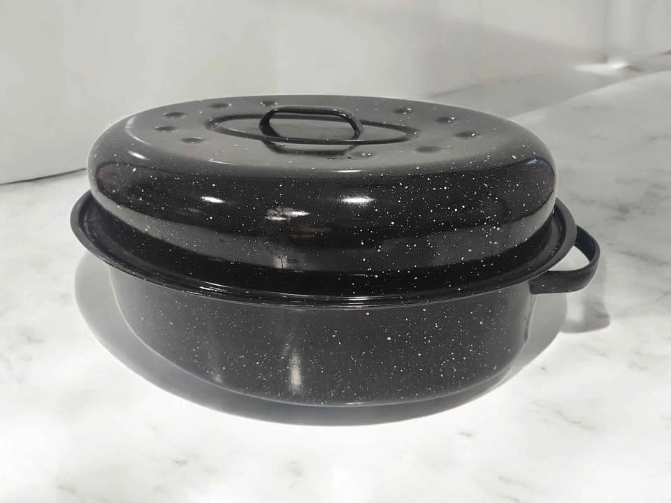 Black Speckled Enamel Roasting Pans: There are several black speckled enamelware pieces, including a large oval roasting pan with a lid, a smaller round roasting pan with a lid, and a rectangular baking or roasting pan. These are often made with a carbon steel core for even heat distribution and a porcelain finish. Copper Double Boiler: A distinctive copper double boiler with a wooden handle and lid is Copper Dish/Pan: A shallow, round copper dish or pan is present, possibly for serving or baking.