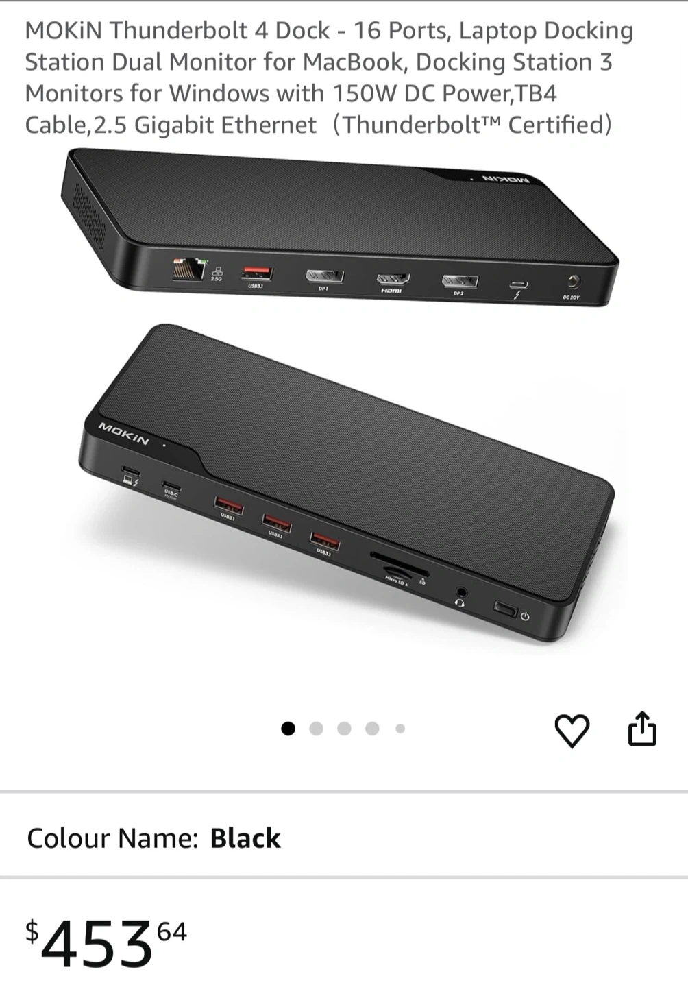 Selling a brand new MOKiN Thunderbolt 4 Docking Station, still sealed in its original box! This docking station offers 85W charging and is perfect for laptops. It features dual monitor support for MacBooks, 3X TB4 Ports 40Gbps, 2.5GbE Ethernet, USB A 3.1, Audio, SD, and is compatible with Thunderbolt 3/4 Mac/PC