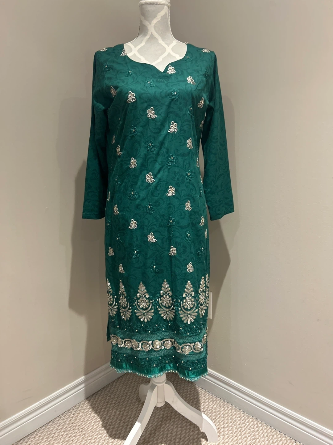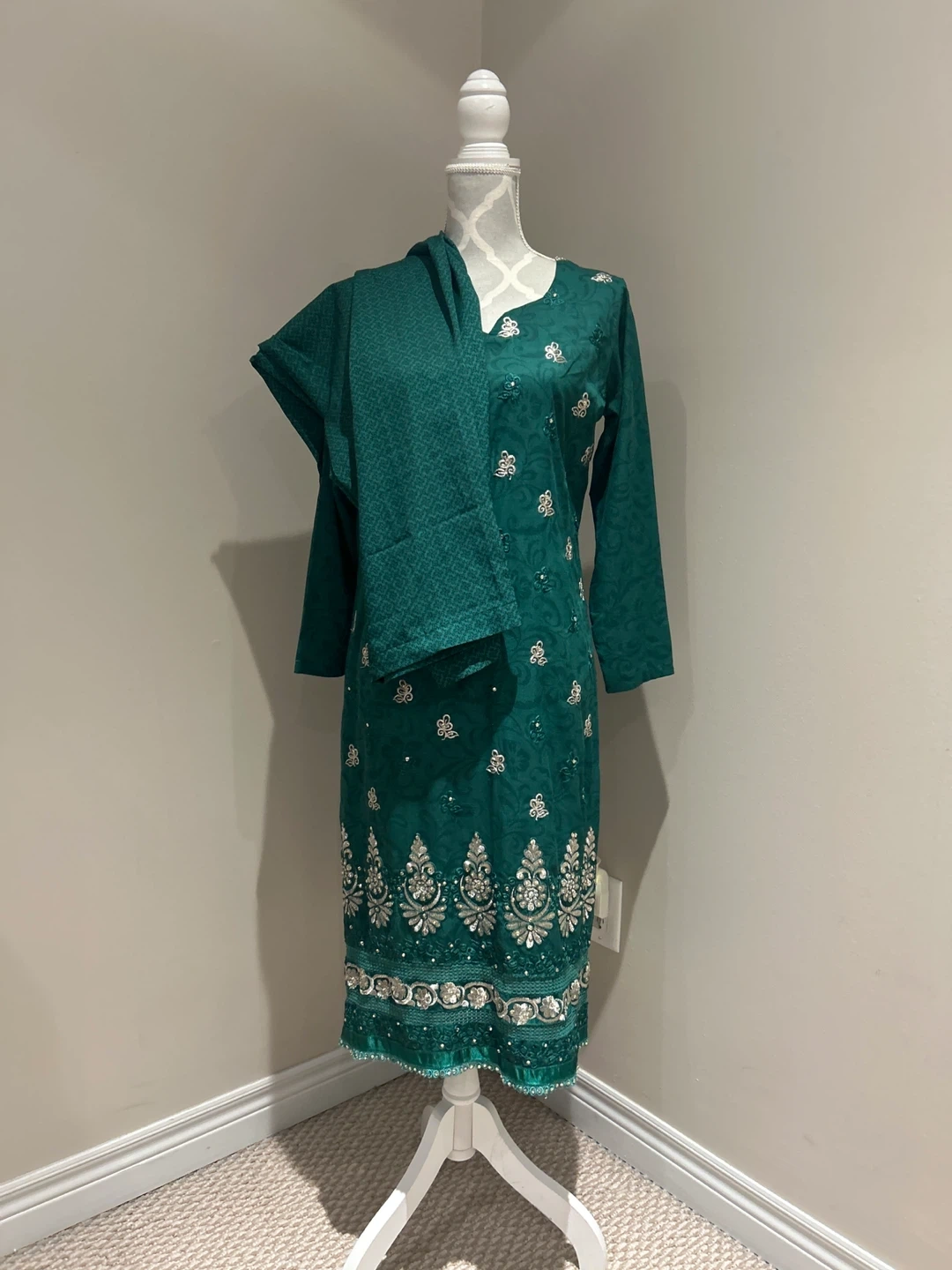Beautiful green salwar kameez suit with intricate embroidery. The fabric has a subtle pattern. Perfect for special occasions or cultural events. Comes with a matching salwar.